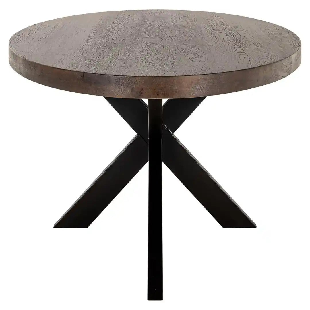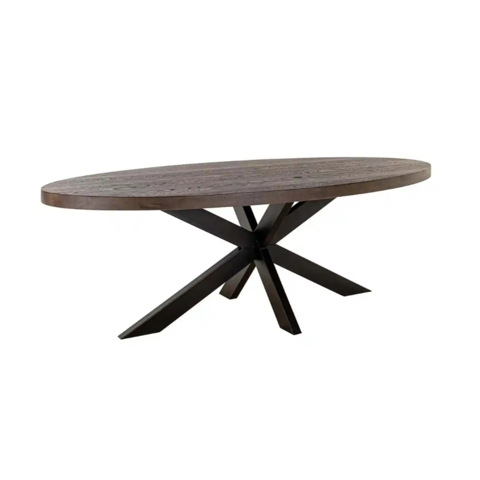 Elegancki stół owalny Watson to połączenie naturalnego piękna drewna z solidnością metalu, które tworzy efektowny mebel do jadalni lub przestrzeni dziennej. Gruby, dębowy blat zachwyca głębokim rysunkiem słojów, a czarna, metalowa podstawa w kształcie rozchodzących się ramion nadaje całości nowoczesny, industrialny charakter.