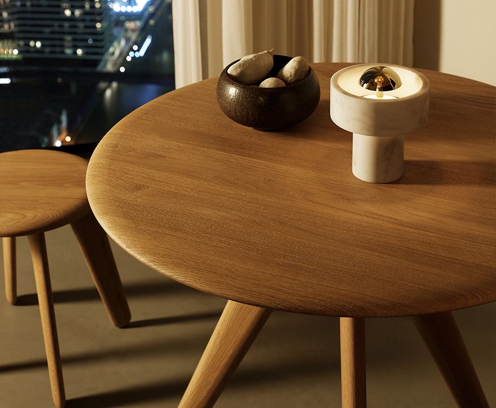 Kolekce Slab oslavuje přirozenou krásu dubu, spojující jednoduché, hranaté tvary s jemně zaoblenými okraji, což dodává nábytku teplý a útulný vzhled. Každý prvek se vyznačuje štědrými proporcemi a robustní konstrukcí. Stolek je k dispozici v přírodním nebo černém lakovaném provedení, což podtrhuje jeho všestrannost a nadčasový charakter.