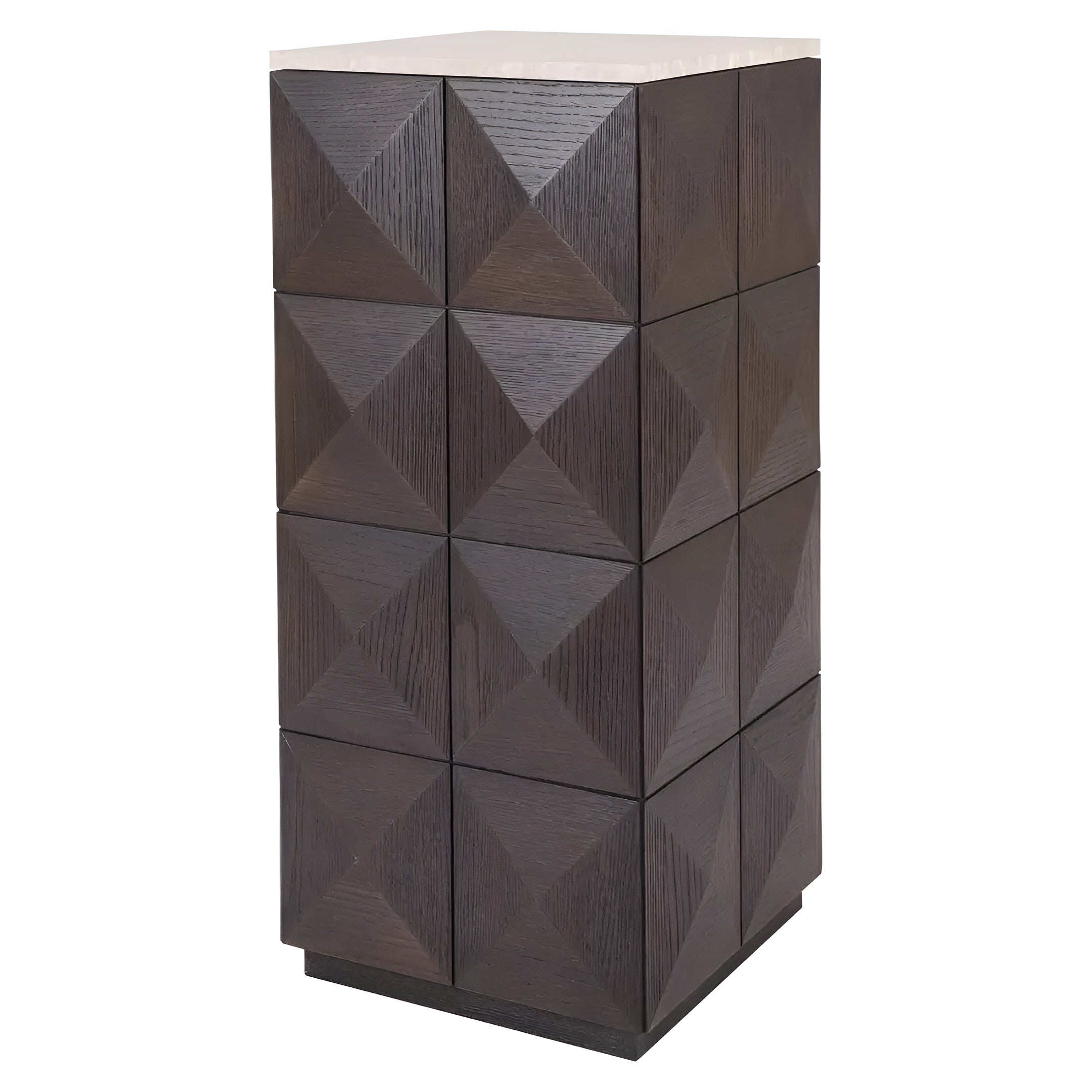 Elegancki stolik Claremont kolumna łączy w sobie nowoczesny design z naturalnymi materiałami, tworząc unikalny mebel o charakterze dekoracyjnym i funkcjonalnym. Geometryczne fronty z drewna dębowego i forniru nadają mu rzeźbiarskiego wyrazu, a blat ze szlachetnego kamienia podkreśla jego luksusowy charakter. Dzięki swojej wysokości świetnie sprawdzi się jako stolik ekspozycyjny, na którym można wyeksponować rośliny, lampę czy dekoracje.