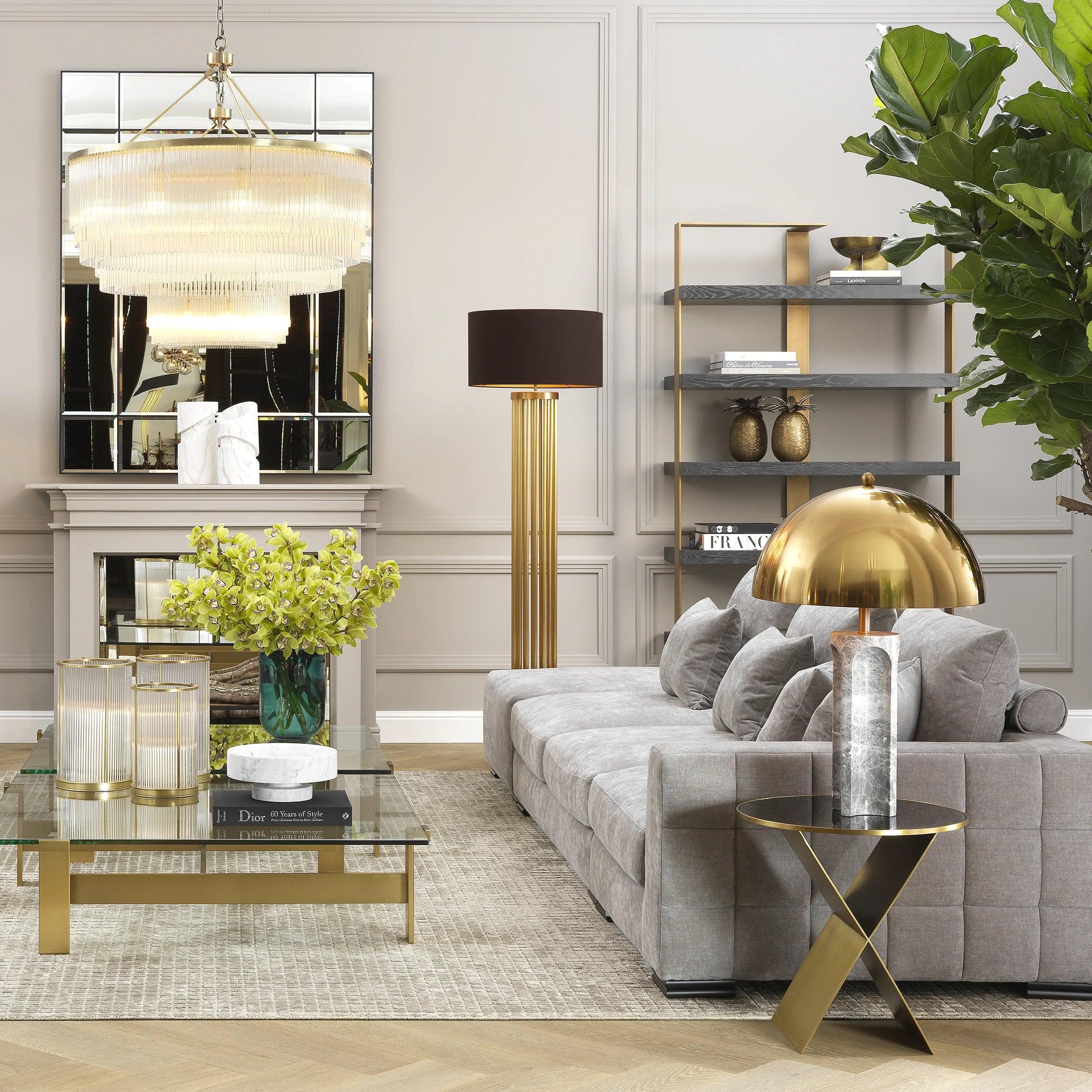 Deska stolku vyrobená z antického zrcadlového skla je dalším mistrovským kouskem. Odráží světlo a dodává hloubku každému prostoru, a elegantně zdobený okraj v barvě antického zlata podtrhuje luxusní charakter tohoto nábytku.