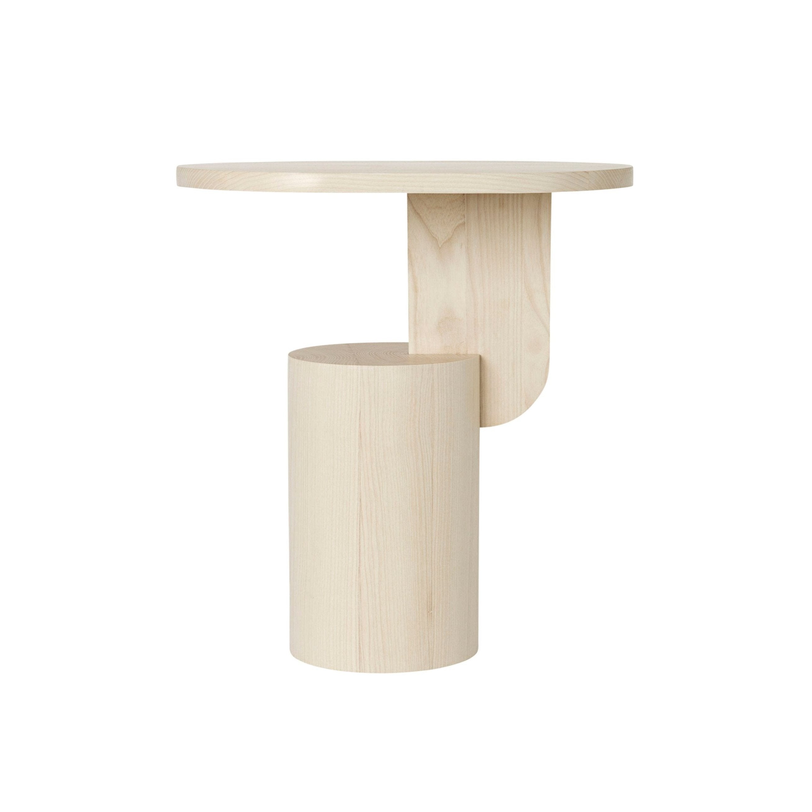 Stolik boczny Insert to solidny, a jednocześnie rzeźbiarski mebel, wykonany z litego drewna jesionowego z certyfikatem FSC™. Jego design wyraża harmonię między masywną cylindryczną podstawą a lekkim, owalnym blatem, który sprawia wrażenie unoszenia się na subtelnym, geometrycznym łączniku.