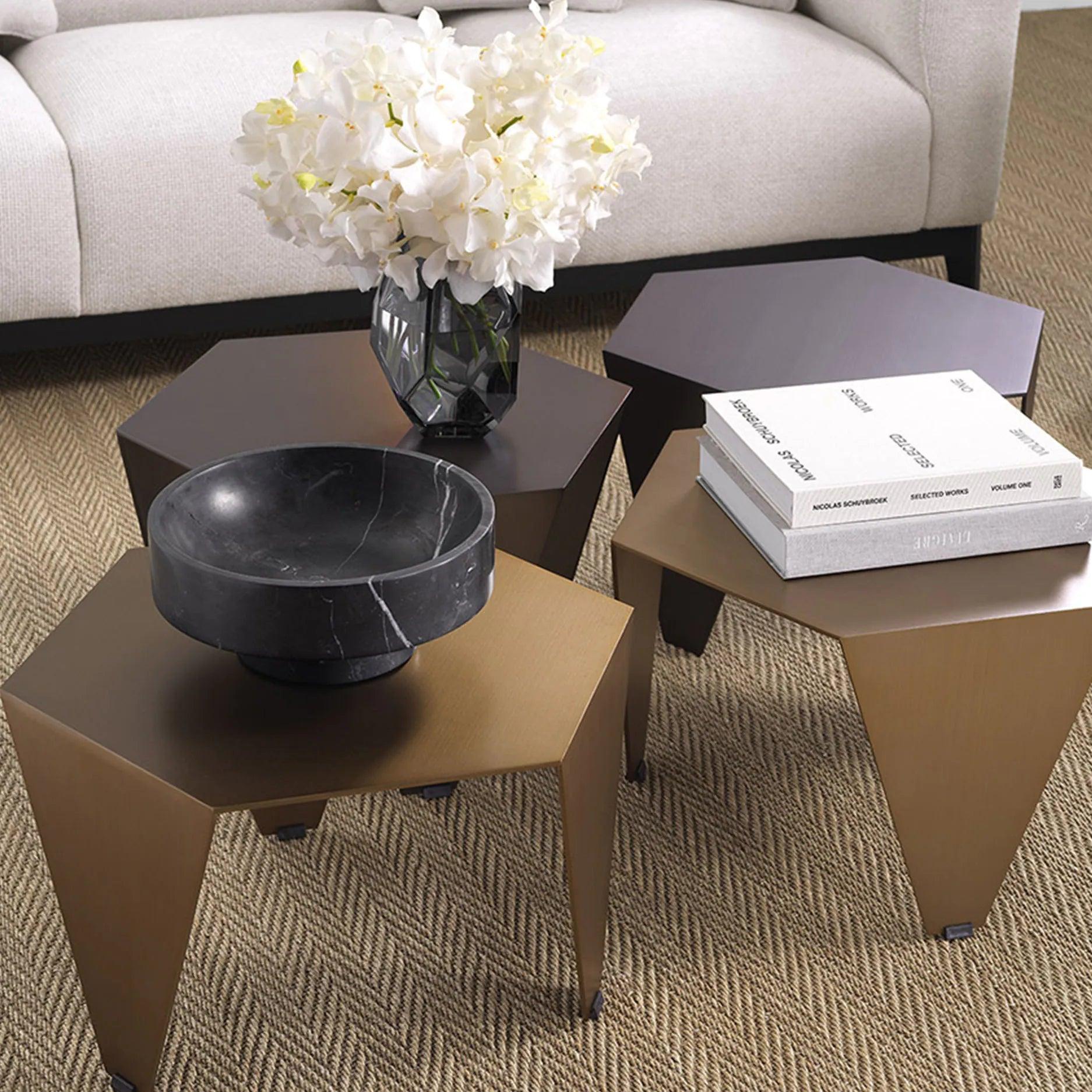 Stolek Metro Chic je rafinovanou kombinací moderního designu s geometrickým půvabem. Jeho šestiúhelníková deska je poctou současným trendům v interiérovém designu, zdůrazňující originalitu a neotřelost tohoto nábytku. Tři prodloužené, zužující se nohy dodávají konstrukci lehkost, zároveň však zachovávají stabilitu a trvanlivost stolku. Jemné bronzové provedení vnáší do interiéru nádech třídy a elegance.