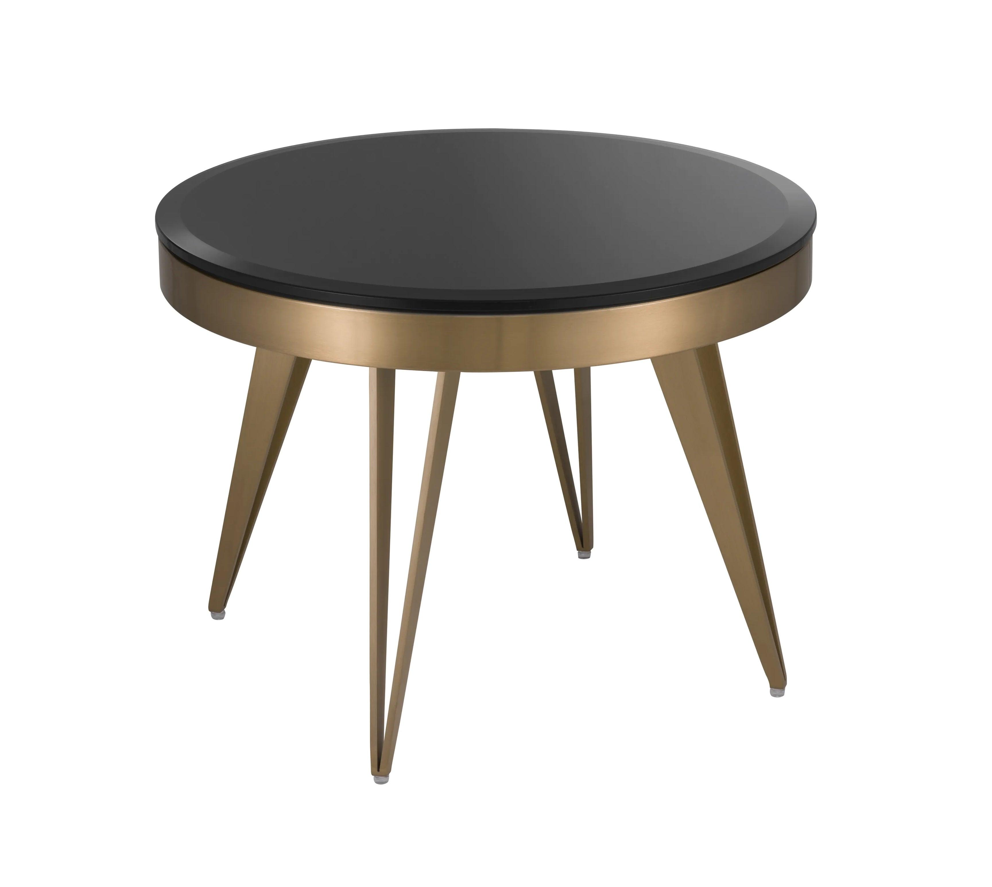 Boční stolek Rocco je esencí moderního stylu a funkčnosti. Od trojúhelníkových, propletených nohou, jejichž povrchová úprava z kartáčované mosazi dodává elegantní lesk, až po kulatou desku vyrobenou z fazovaného černého skla - každý detail tohoto stolu byl pečlivě promyšlen, aby spojoval krásu a praktičnost.