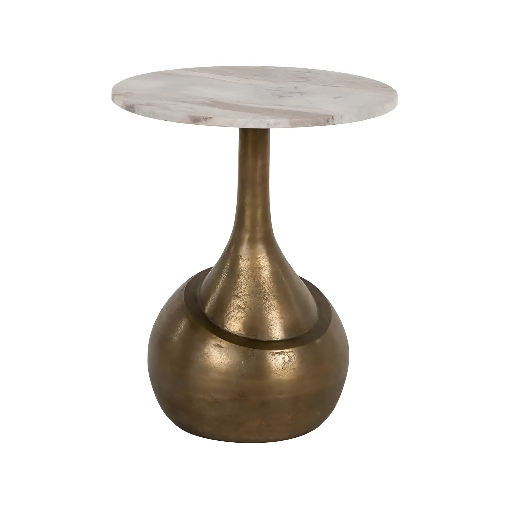Boční stolek Sia v elegantním stylu art déco se vyznačuje jedinečným tvarem připomínajícím kapku a povrchovou úpravou v odstínu antického zlata. Deska z mramoru Toronto harmonicky ladí s designovou základnou, čímž vytváří nábytek, který dokonale spojuje funkčnost s dekorativním charakterem. Je to ideální doplněk do interiérů zařízených s důrazem na detaily a rafinovaný styl.