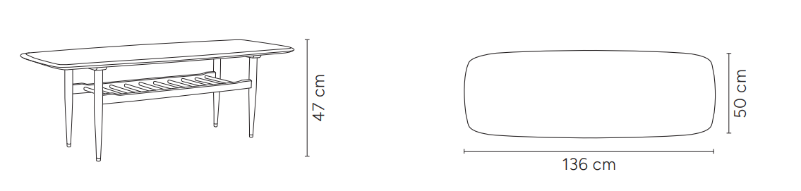 Jedním z charakteristických prvků tohoto stolku je lehká police umístěná pod deskou. Tato subtilní a minimalistická konstrukce odkazuje na nejvýznamnější retro projekty, přičemž dodává nezaměnitelný vintage šarm. Police nejenže plní praktickou funkci, umožňující ukládání drobných předmětů či dekorací, ale také dodává stolku jedinečný charakter.