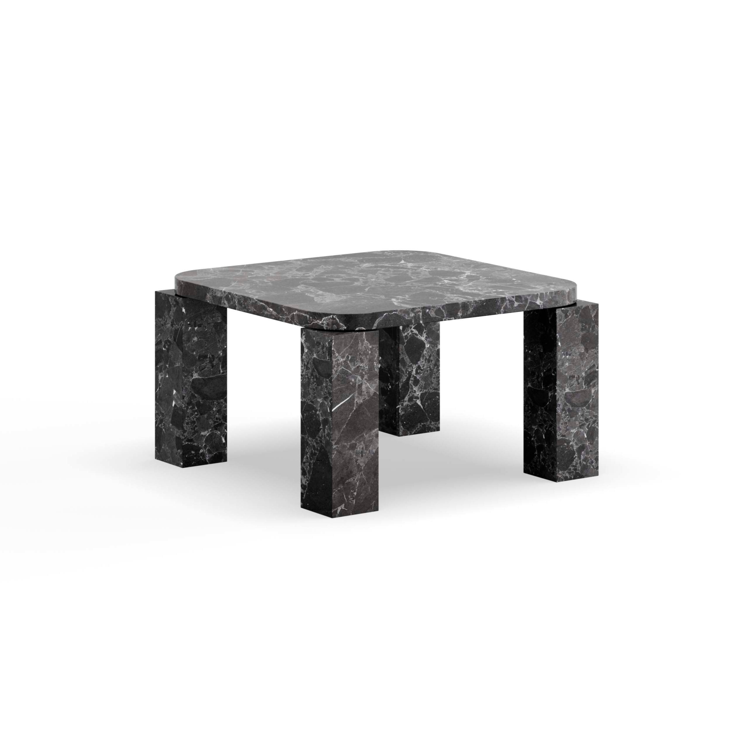 Czarny trawertyn nadaje stolikowi elegancką, surową estetykę, podkreśloną przez naturalne wzory i subtelną fakturę kamienia. Dzięki geometrycznej harmonii, łączącej kwadrat i koło, stolik Atlas emanuje siłą, stabilnością i ponadczasowym designem, doskonale komponując się zarówno w nowoczesnych, jak i klasycznych wnętrzach.