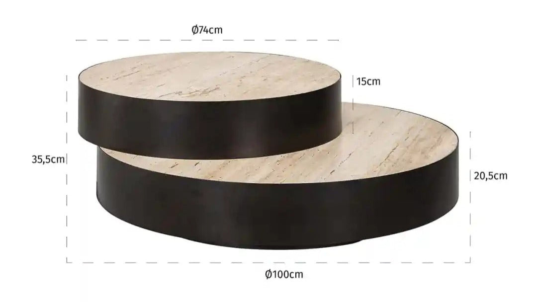 Elegantní konferenční stolek Avalon v moderním designu je návrh, který dodá interiéru jedinečný charakter. Kulatý stůl vyrobený z travertinu v kombinaci s tmavou, masivní základnou z překližky a železa vytváří harmonické spojení přírodní krásy a industriální pevnosti. Jeho geometrická forma z něj činí centrální bod aranžmá, ideální jak pro minimalistické, tak pro výraznější prostory.