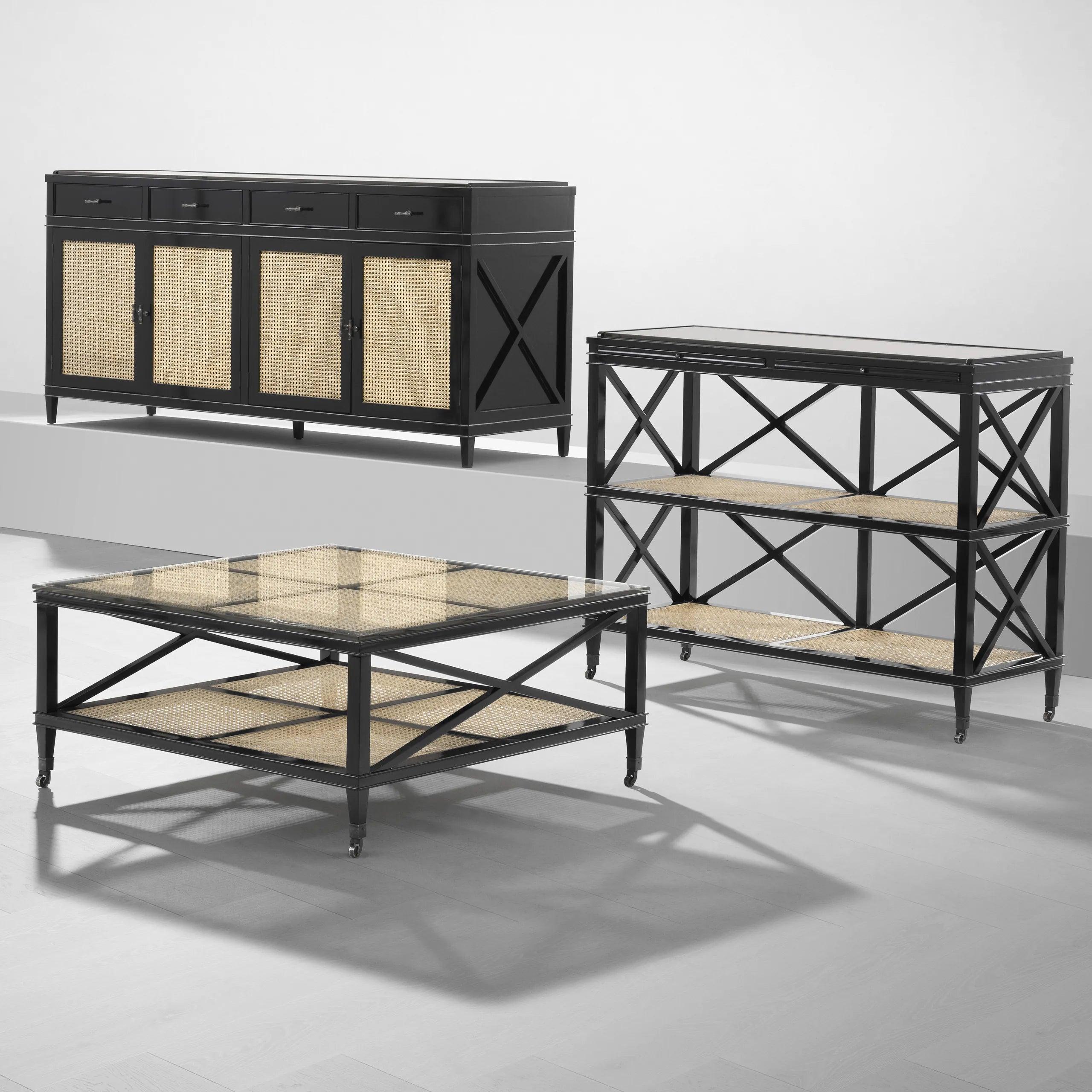Stolek se skládá z dřevěného rámu vyrobeného z mahagonu s černým povrchem. Toto spojení klasického materiálu s moderním akcentem dodává nábytku jedinečný charakter. Rám tvoří pevnou oporu pro desky stolu, čímž vytváří soudržnou konstrukci. Deska stolku a dolní police byly vyrobeny z přírodní sítě z cukrové třtiny, což odkazuje na exotické motivy karibských ostrovů a dodává nábytku teplo. Průhledné sklo, které pokrývá desku, vnáší prvek lehkosti a umožňuje obdivovat detaily sítě a dřevěného rámu.