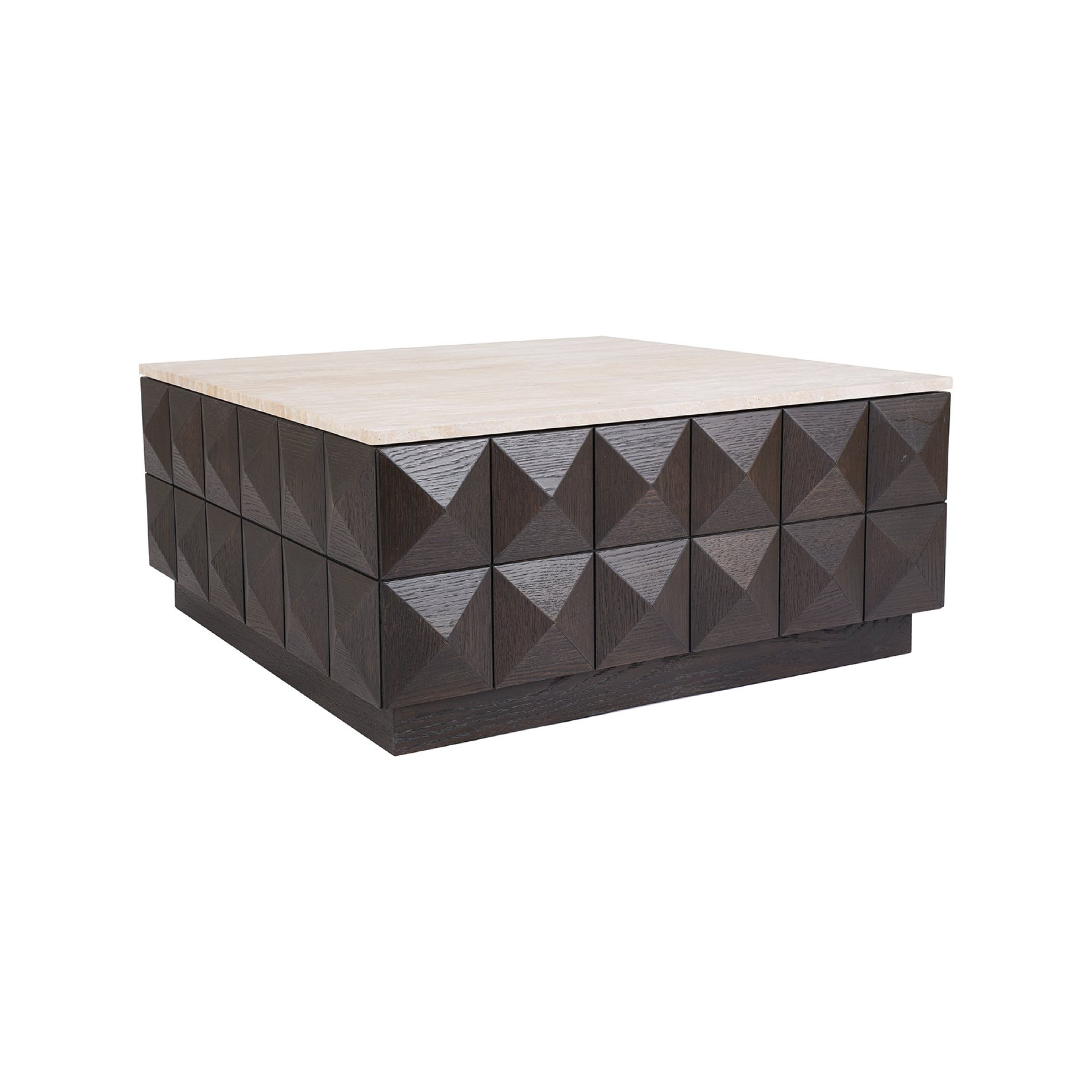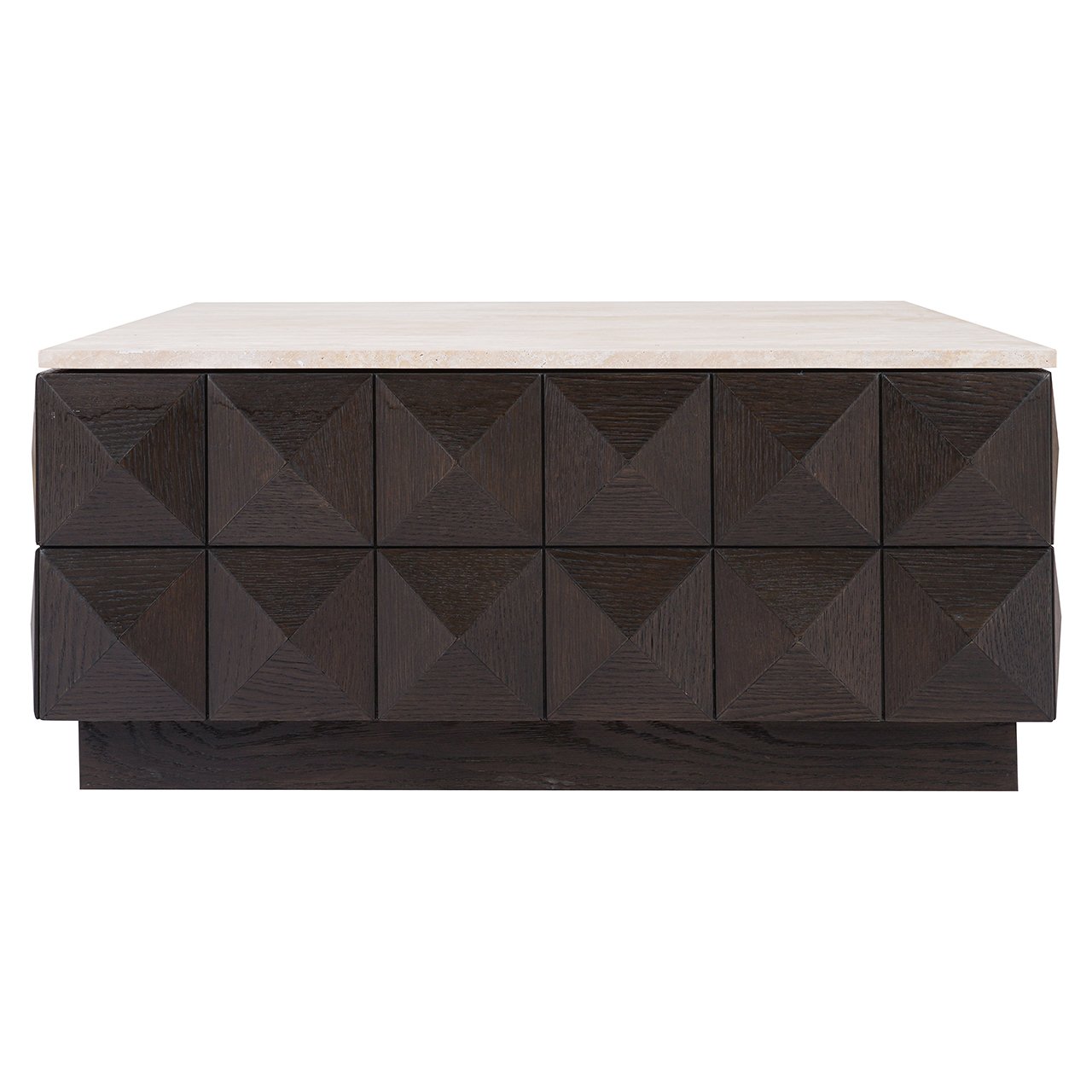 Konferenční stolek Claremont je jedinečný kus nábytku, který spojuje přirozenou krásu dřeva a eleganci kamene. Geometrické čelní plochy z dubového dýhy vytvářejí působivou, trojrozměrnou strukturu, která dodává charakter každé aranžaci. Světlá deska z kamene kontrastuje s tmavým dřevěným povrchem, což celku dodává moderní a zároveň nadčasový styl. Tento konferenční stolek se stane středobodem obývacího pokoje, přinášející harmonii a rafinovaný design.