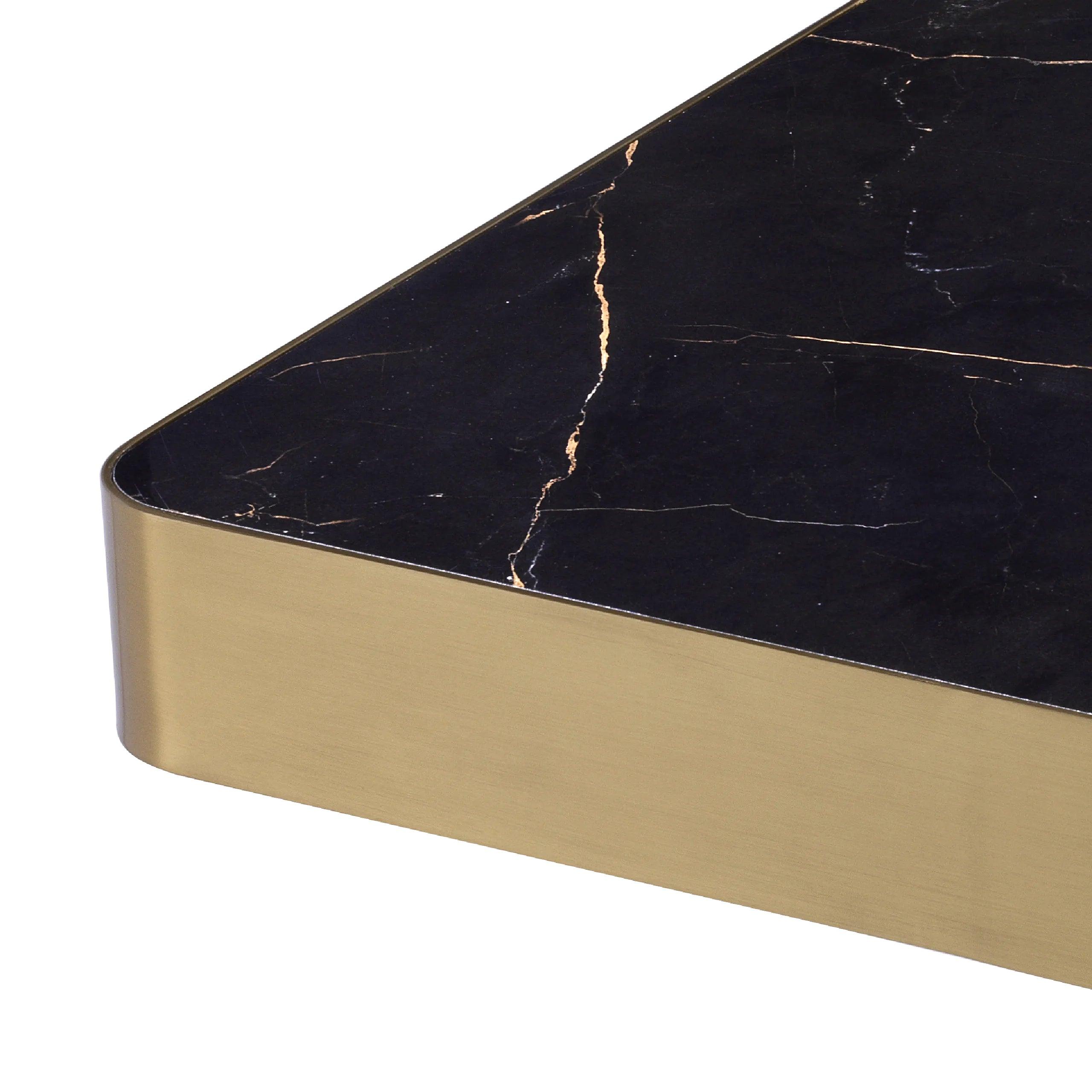 Zaoblené rohy dodávají stolku jemnost a činí ho lehčím, přestože má robustní konstrukci. Základna s povrchovou úpravou z kartáčovaného mosazi přidává lesk a přitahuje pozornost, zatímco kontrastuje s tmavým keramickým vrchem, který imituje vzhled mramoru. Okraj z kartáčovaného mosazi představuje další, efektní akcent, který podtrhuje eleganci a rafinovanost stolku.