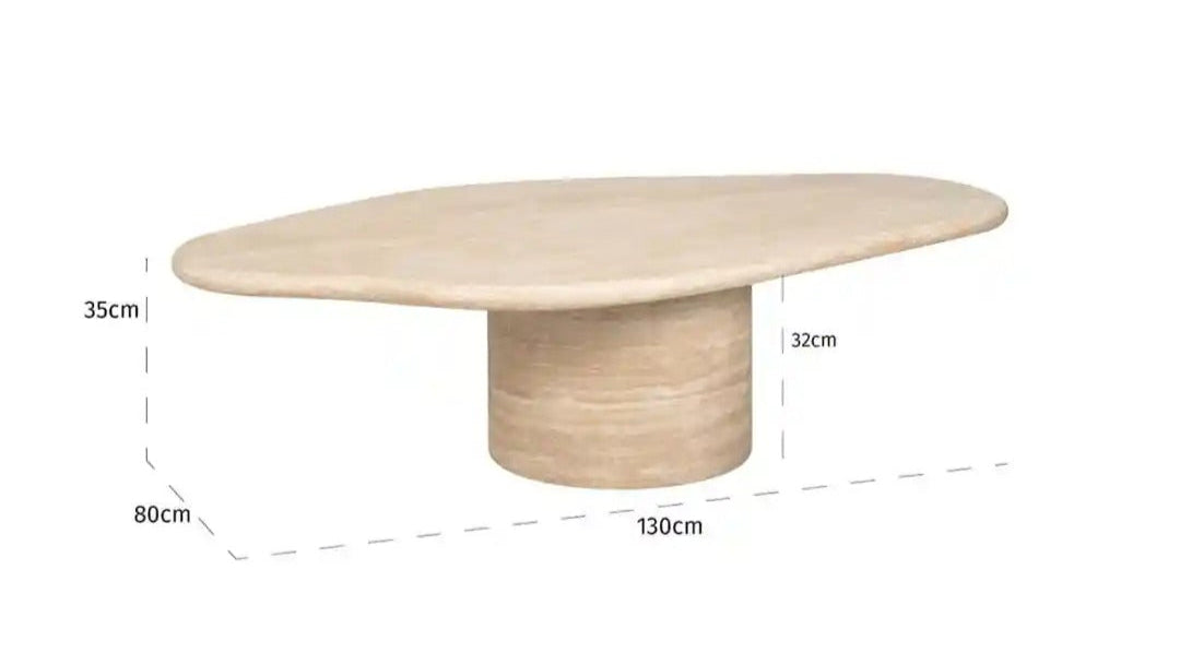 Elegantní konferenční stolek Fictus s nepravidelnou deskou je návrhem pro ty, kteří hledají výjimečný nábytek, jenž vnese do interiéru moderní charakter. Kombinace imitace travertinu, železa a MDF desky zajišťuje, že je nábytek zároveň pevný a působivý. Jemně zaoblené hrany desky mu dodávají organickou lehkost, zatímco cylindrická základna přináší prvek minimalistické geometrie.