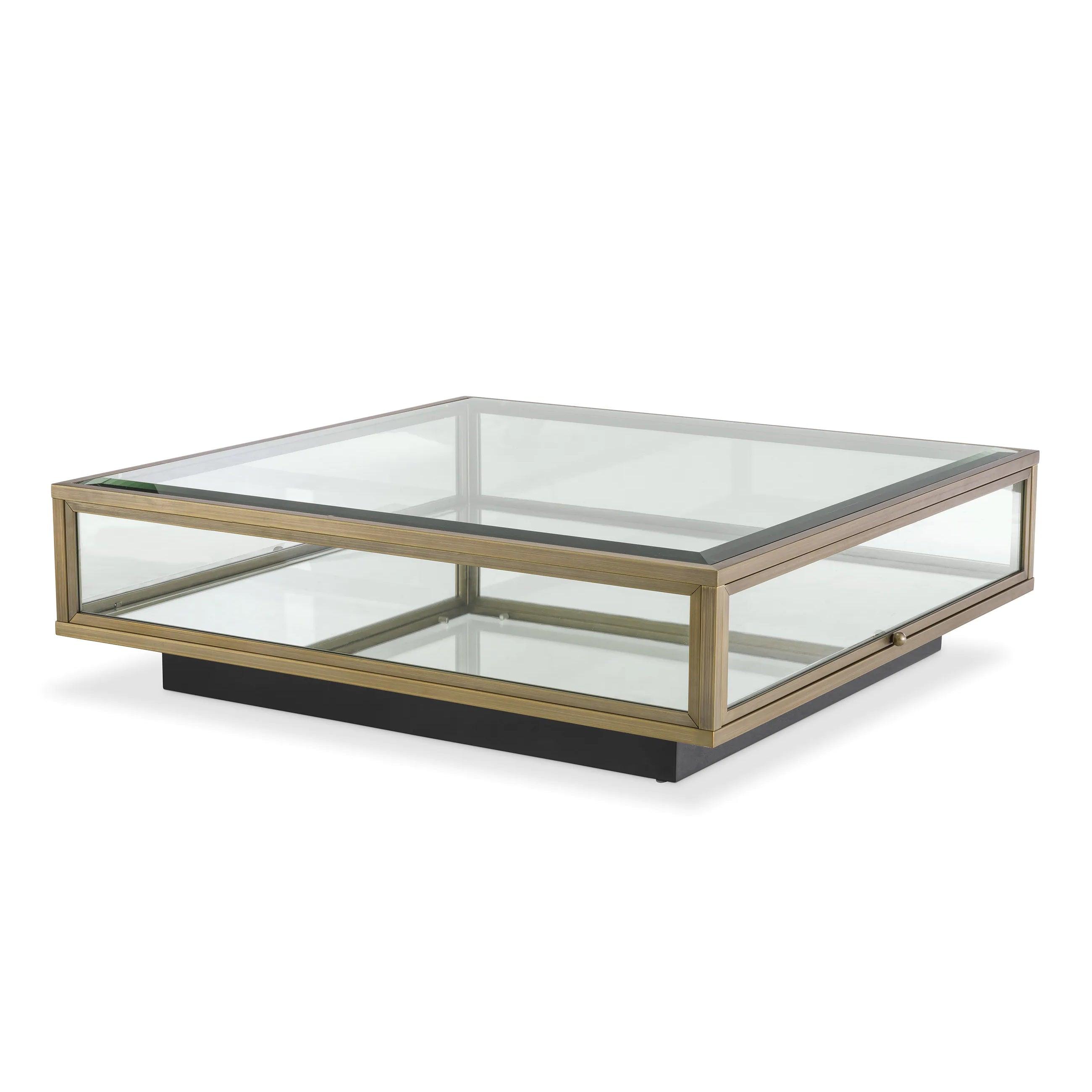 Kávový stolek Ryan je výjimečná kombinace elegance a funkčnosti. Jeho konstrukce, spojující povrchovou úpravu kovu z kartáčovaného mosazi s průhledným fazovaným sklem, připomíná jak klasickou krásu antického nábytku, tak moderní jednoduchost současných vzorů.