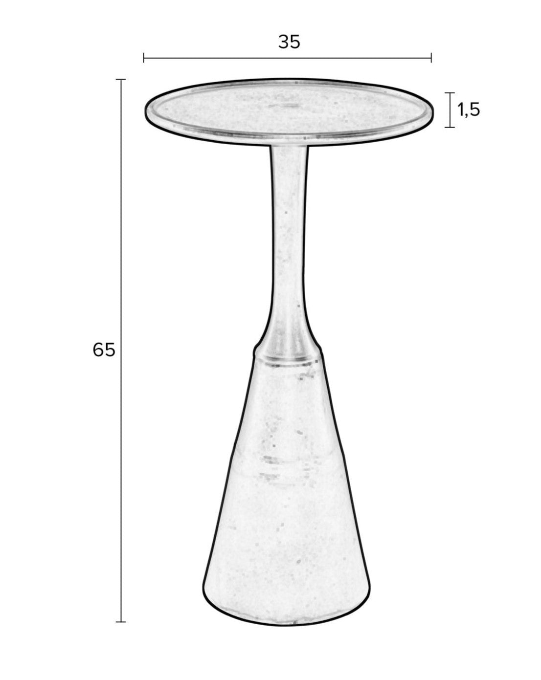 Oválná deska o průměru 35 centimetrů zajišťuje pohodlné používání. Celý je vyroben z hliníku, pokrytý barvou, stolek má stabilní konstrukci díky kovovému sloupu, který se rozšiřuje u základny.