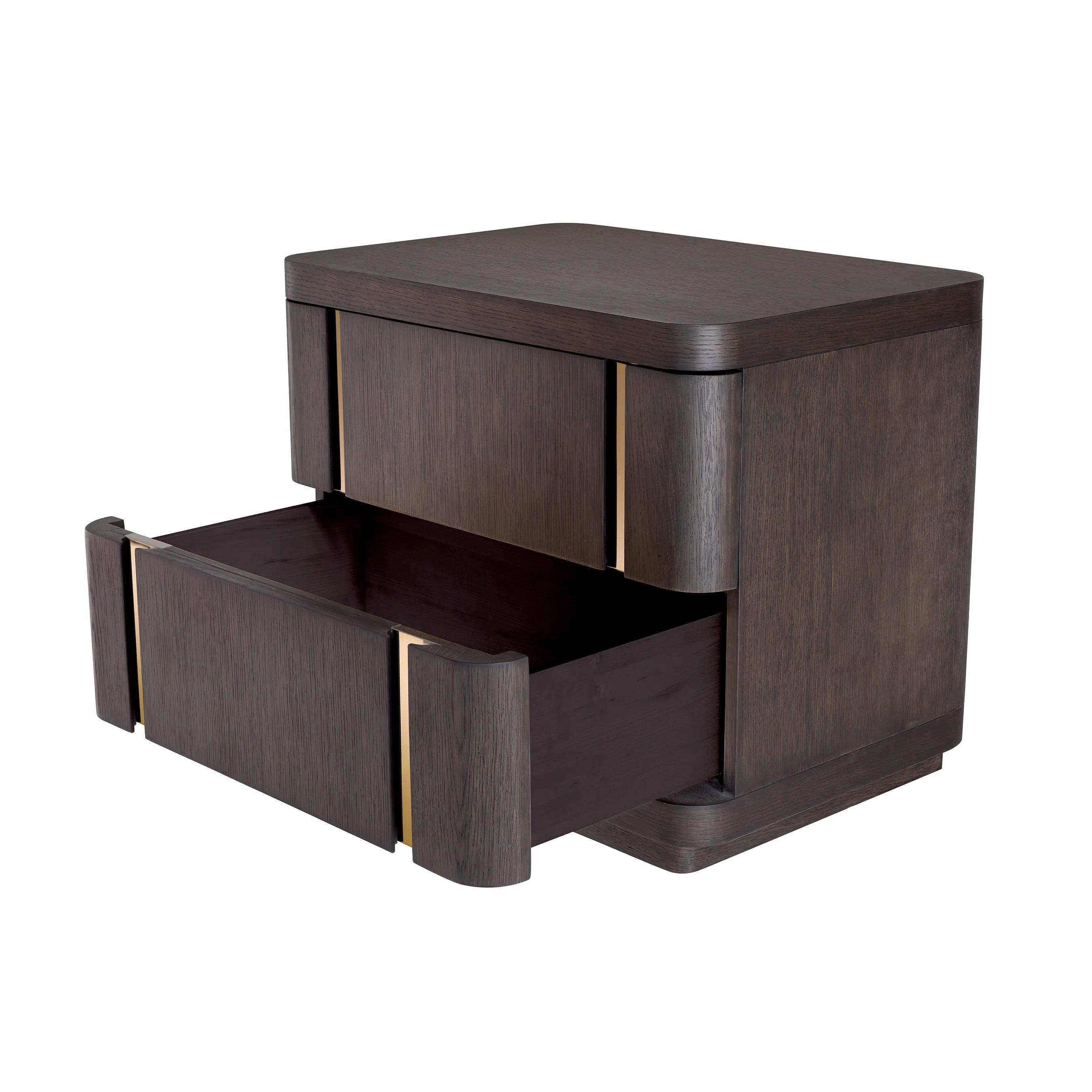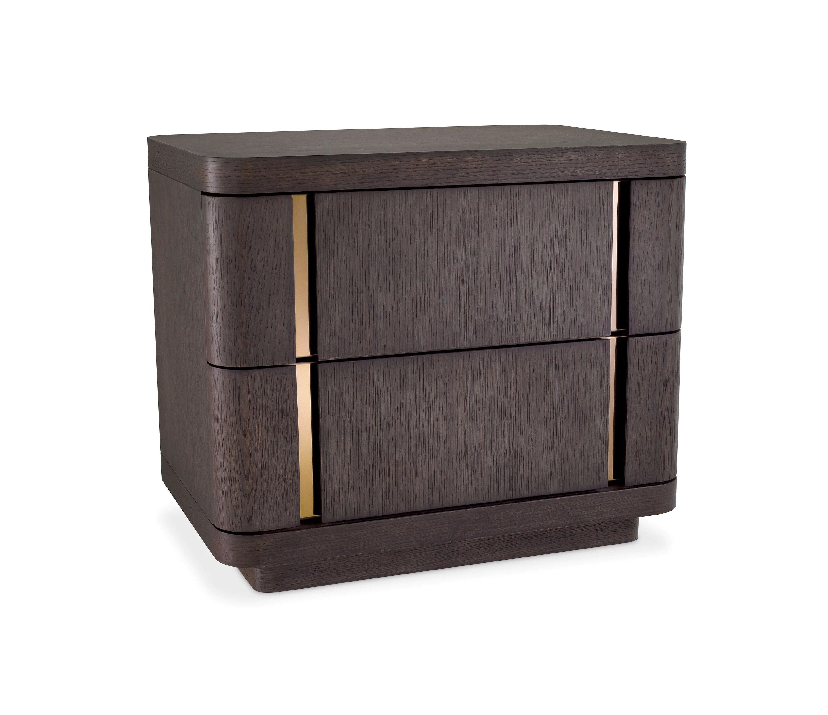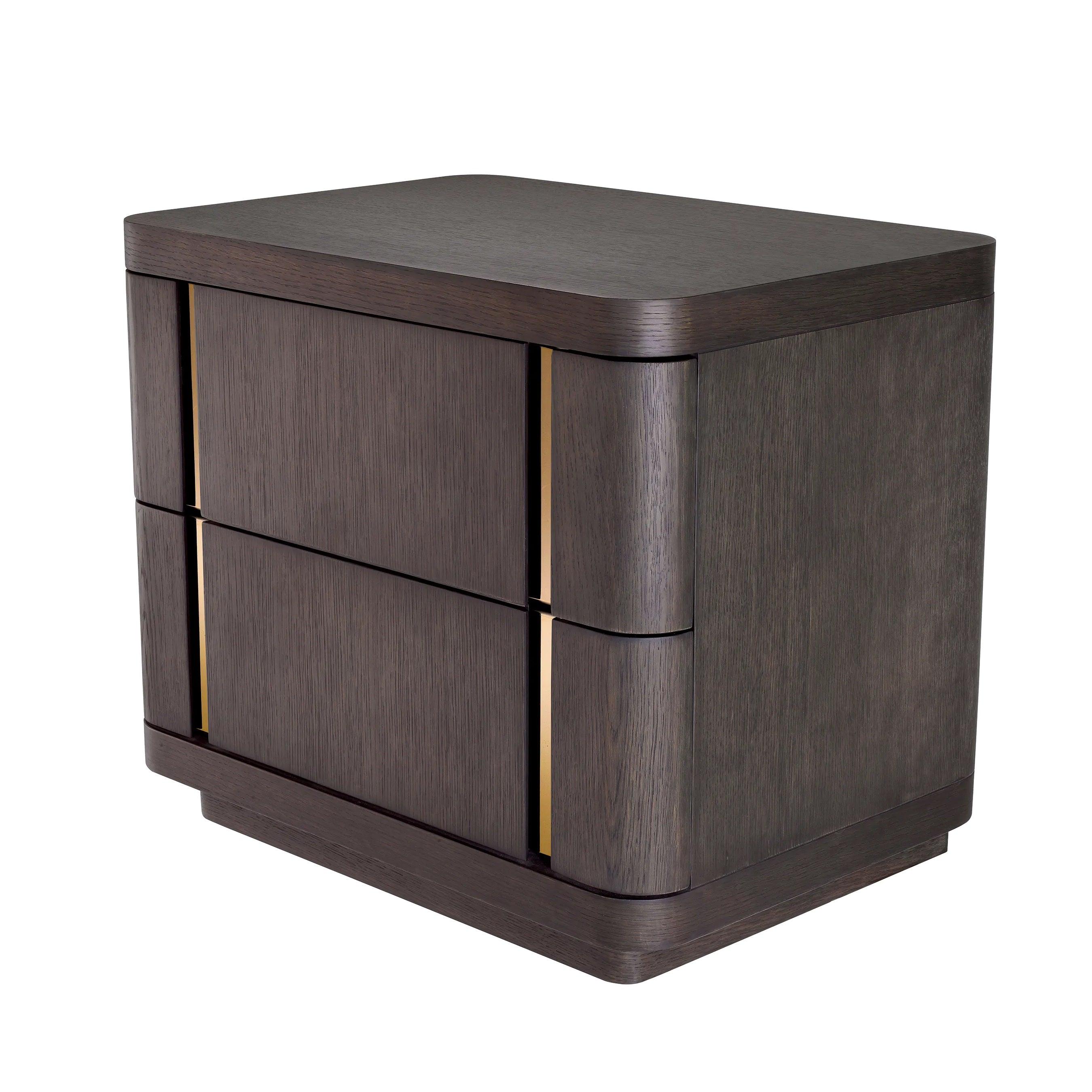 Inspirace skandinávským stylem je patrná v každém detailu. Elegantní dýha z mokka dubu, kombinovaná s jemně zakřivenými okraji, vytváří nábytek s klidným a zároveň moderním charakterem. Dvě prostorné zásuvky s lesklými vložkami z kartáčovaného mosazi nejen přidávají na třídě, ale také nabízejí praktické místo pro uložení věcí.