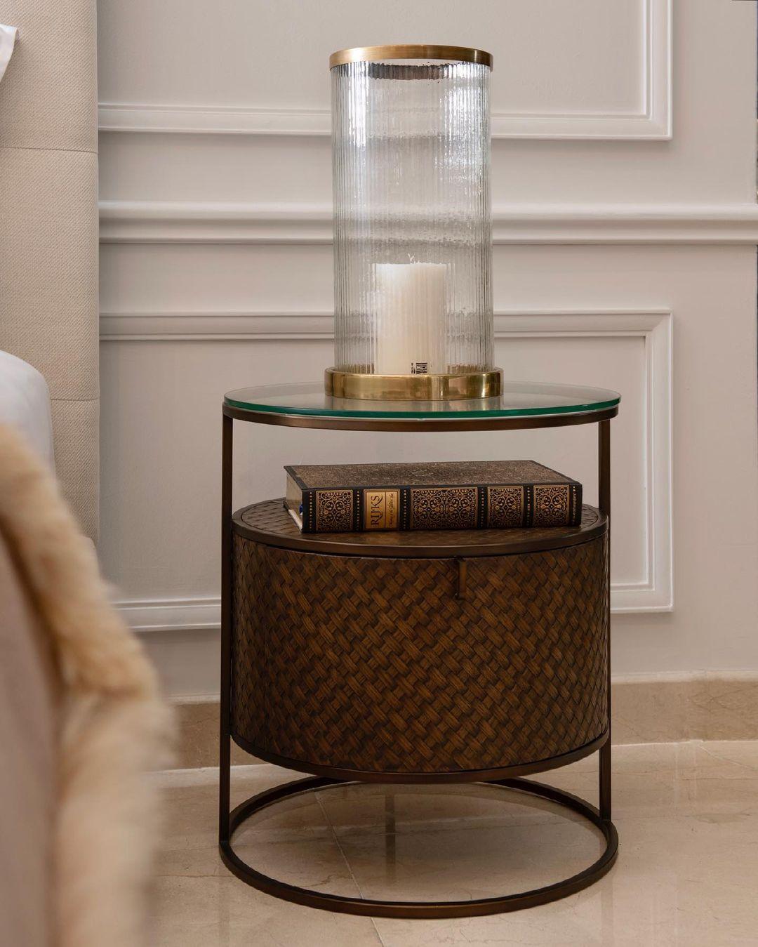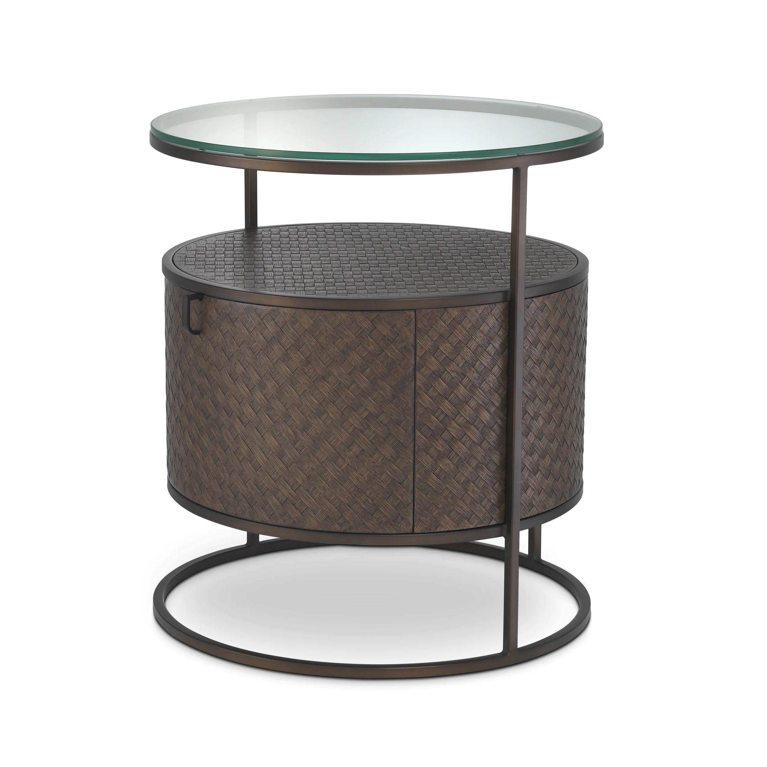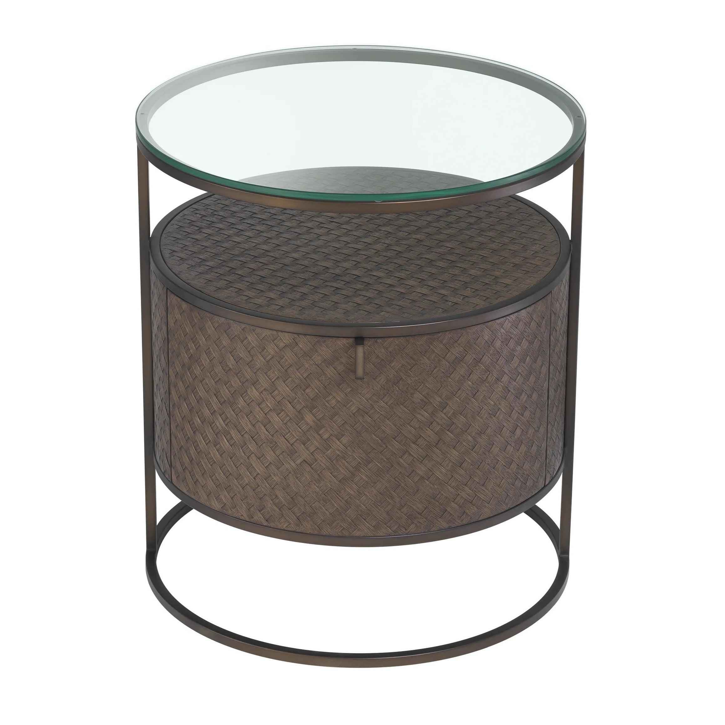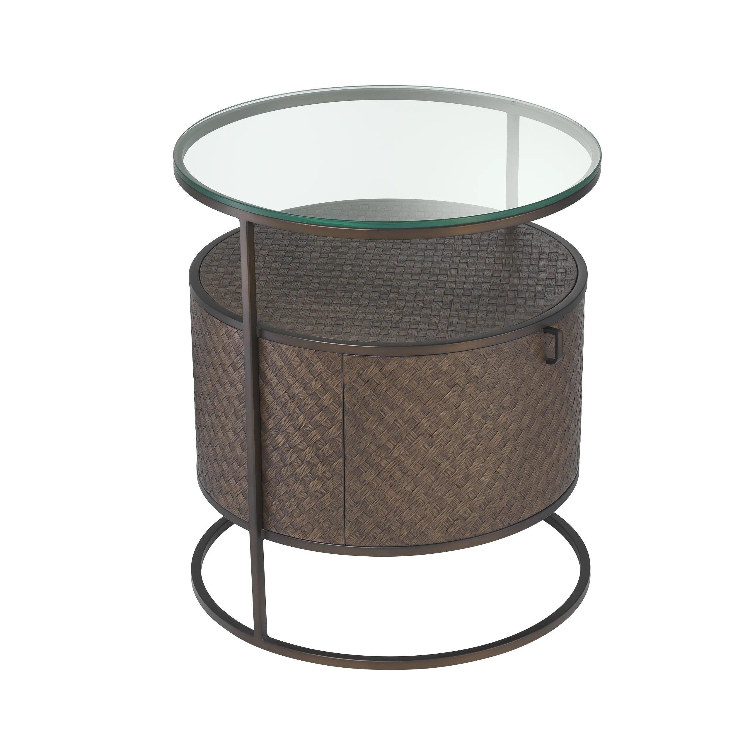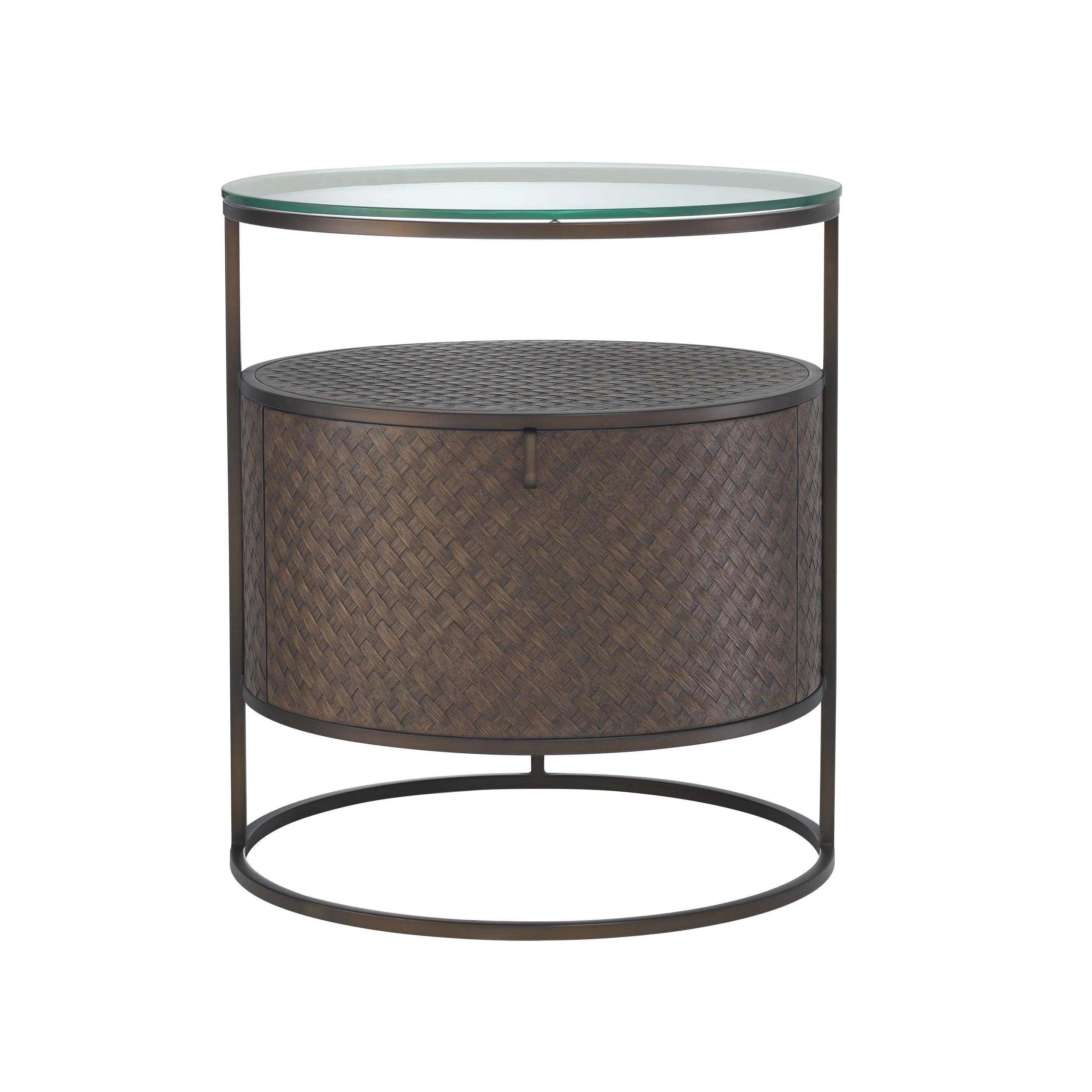 Jeho elegantní rám, vyrobený z nerezové oceli, kontrastuje s průhlednou skleněnou deskou, čímž vytváří harmonickou a zároveň fascinující kompozici. Centrální prvek ve tvaru bubnu, potažený tkaným dubovým dýhováním, dodává hloubku a charakter celému projektu. Uvnitř tohoto bubnu se skrývá praktická zásuvka s jemnou rukojetí z nerezové oceli, která je ideální pro ukládání drobností.