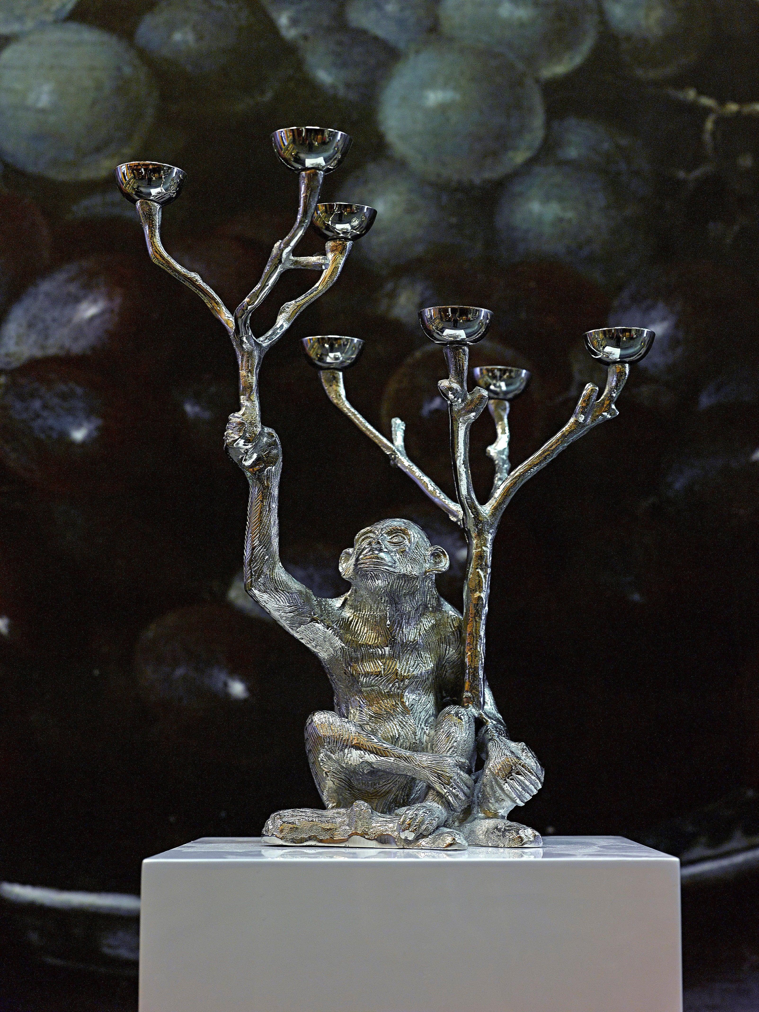 Svietník Monkey v stříbrné barvě je spojení elegance a klasického designu. Neobyčejně precizní zpracování a péče o každý, i ten nejmenší detail, dává tomuto modelu jedinečný charakter. Hluboká, stříbrná barva podtrhuje krásu svietníku Monkey a navíc zvýrazňuje sochu opice. Svietník je vyroben z niklovaného mosazi.
