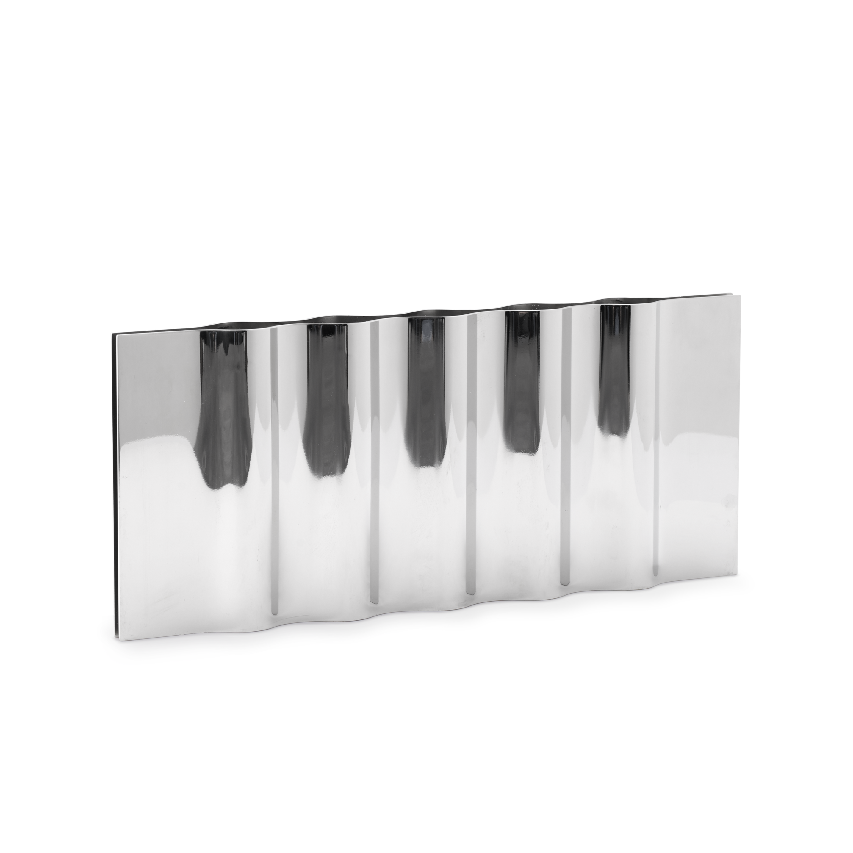Svícen Ripply je elegantní interpretací přírodních vln na hladině vody, zachycenou v leštěné nerezové oceli. Jeho organické, vlnící se tvary jemně odrážejí světlo a okolí, vytvářející hypnotizující vizuální efekt.