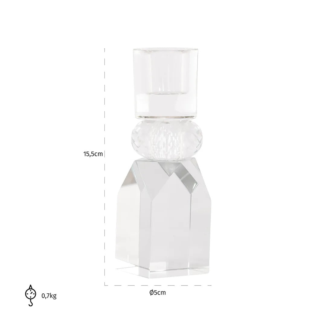 Moderní svícen Yanou ze skla je originální dekorace, která dodá interiéru výjimečný charakter. Jeho geometrická forma okouzluje jedinečným designem a přitahuje pohledy.
