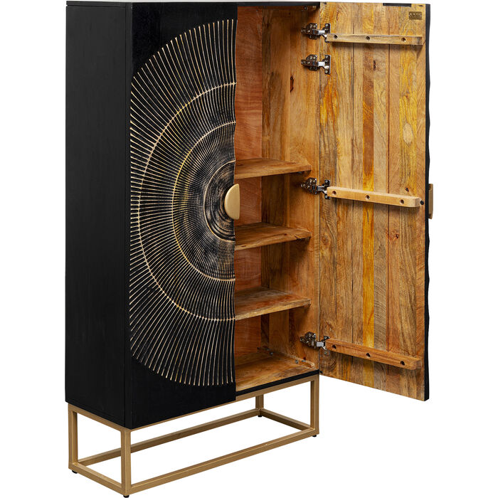 Díky svému kouzlu se tato skříň stane novým oblíbeným kouskem nábytku, který plní různé funkce: jako místo pro uložení nádobí, sklenic, ubrusů, jako domácí bar nebo exkluzivní skříň na boty. Vyrobená z mangového dřeva a oceli s práškovým nástřikem, tato jedinečná skříň se také vyznačuje pečlivě vybranými materiály. Trvanlivý kus nábytku, který si jistě udrží svou hodnotu.