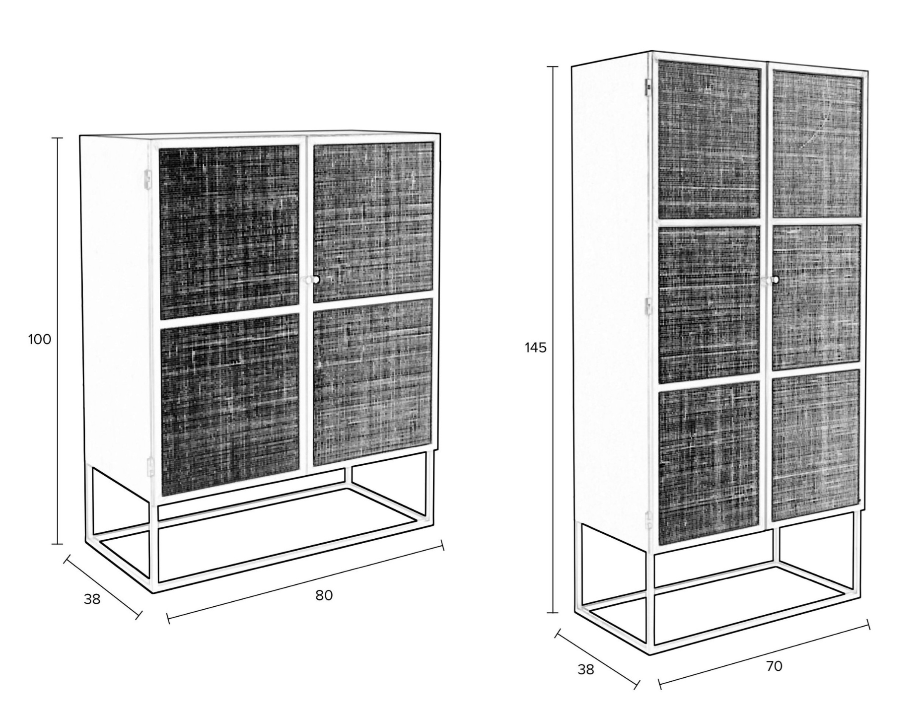 Skříňka s 2 dveřmi Guuji je rafinovaná a stylová skříň, která spojuje moderní design s přírodními prvky. Vyrobena z lakovaného dřeva MDF, vybavená okouzlujícími ratanovými dvířky, vytváří elegantní kontrast mezi černými prvky MDF a přírodním povrchem ratanu. Pevné železné nohy s práškovým lakováním zajišťují stabilitu a trvanlivost nábytku. Skříňka Guuji je ideální kombinací funkčnosti a estetiky, která se skvěle hodí do různých interiérových aranžmá a dodává jim stylový charakter.