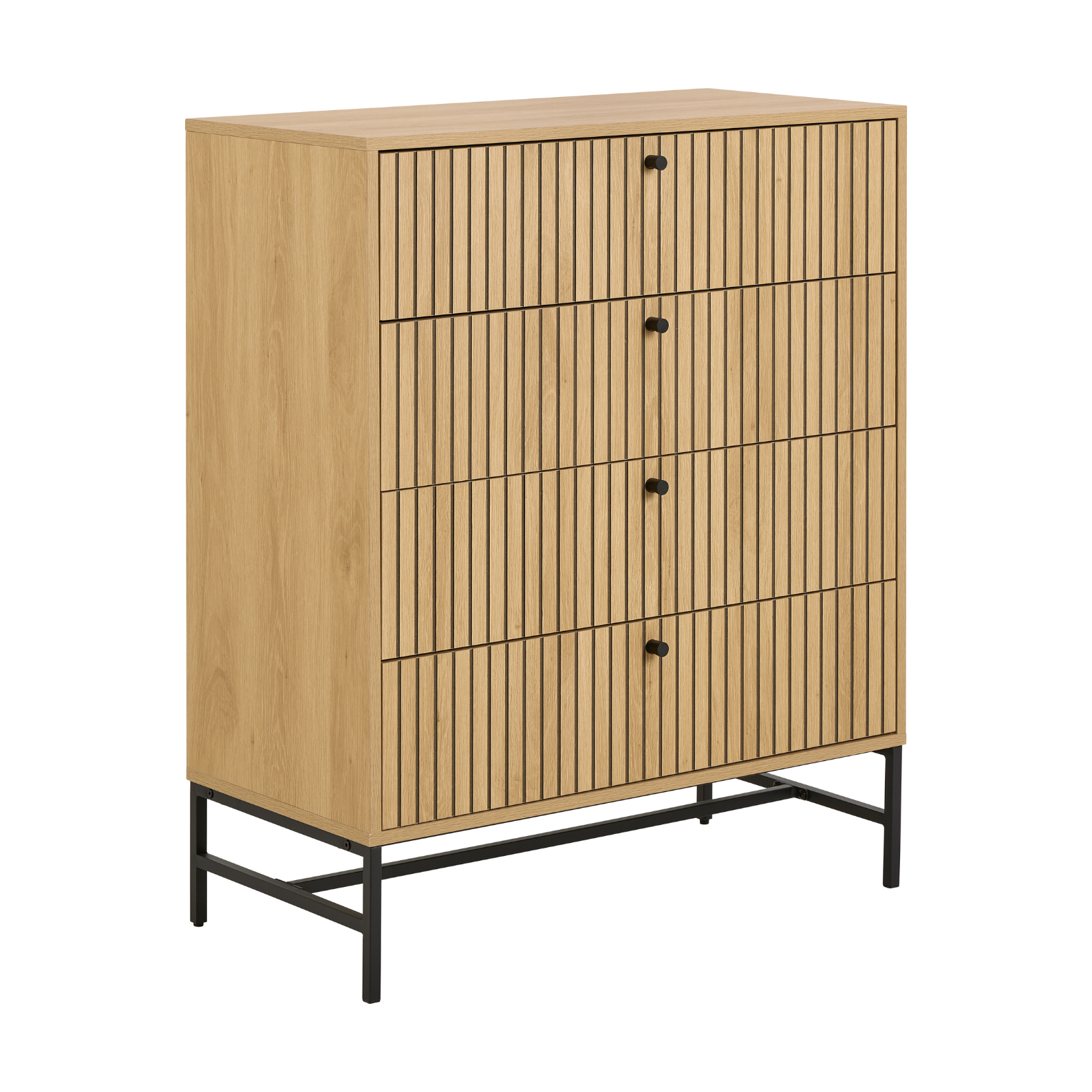 Szafka wyposażona jest w trzy lub cztery pojemne szuflady, które oferują wystarczająco dużo miejsca na przechowywanie niezbędnych przedmiotów. Łatwa w utrzymaniu powierzchnia z melaminy zwiększa jej funkcjonalność, a solidna podstawa z matowej, czarnej stali malowanej proszkowo zapewnia stabilność i trwałość. To doskonały wybór do sypialni, salonu czy przedpokoju, łączący estetykę z praktycznością.