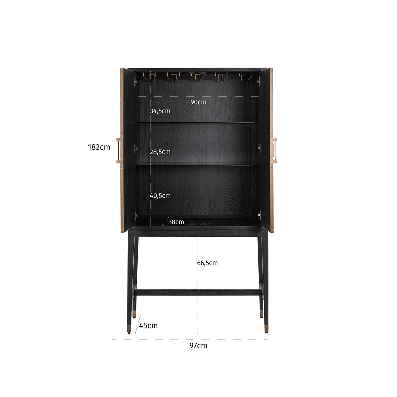 Vestavěné háčky na skleničky činí tuto barovou skříňku multifunkčním produktem, ideálním pro využití v kuchyni, jídelně nebo obývacím pokoji. Je to dokonalé místo pro ukládání různých doplňků spojených s přípravou a servírováním nápojů. Matné zlaté kovové detaily dodávají nábytku jemné, luxusní akcenty, které podtrhují jeho jedinečnost.