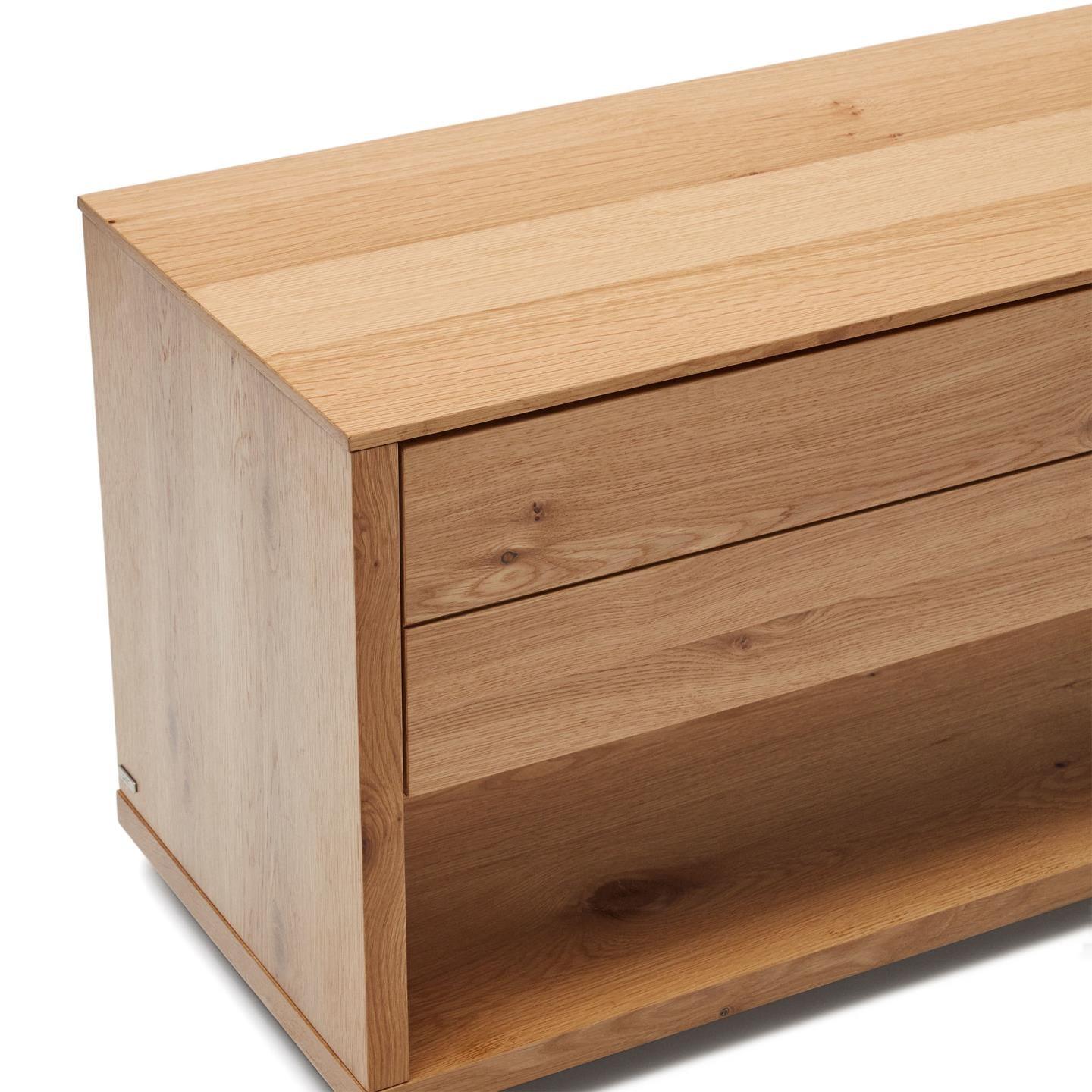 RTV skříň Alguema, vytvořená renomovaným designérským týmem Kave Home, představuje jedinečný návrh pro ty, kteří hledají klid a relaxaci ve svých interiérech. Kombinace minimalistického stylu s rafinovanou dubovou dýhou v přírodním provedení činí tuto kolekci nejen funkční, ale i esteticky ohromující.