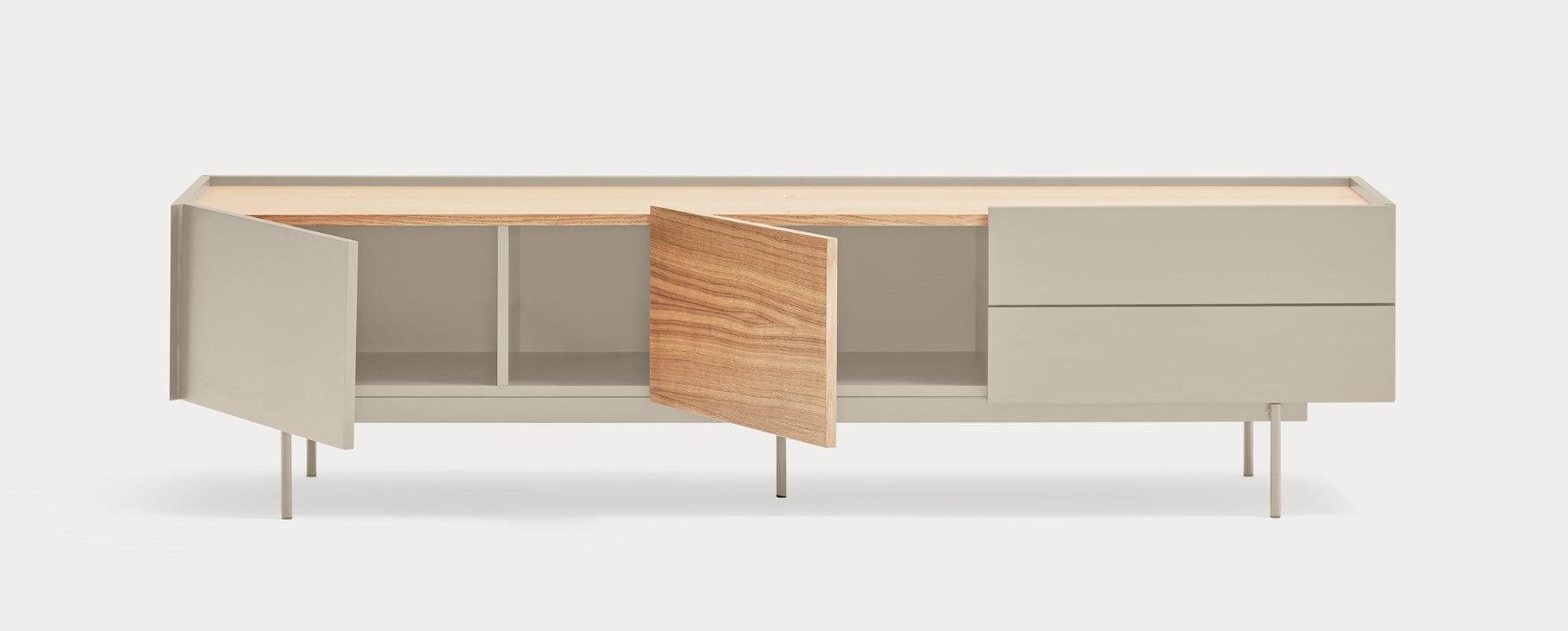 Televizní stolek Otto v béžové barvě se vyznačuje moderním stylem s čistými liniemi, kde jemný odstín béžové harmonicky ladí s akcenty přírodního dýhy, což umožňuje jeho přizpůsobení různorodým prostorům. Jeho konstrukce byla speciálně navržena s ohledem na funkčnost - disponuje otevřeným prostorem s jednou policí, ideální pro uskladnění audio-vizuální techniky nebo dekorací, a také párem dveří. Za dveřmi se nacházejí police, které poskytují další prostor pro uskladnění různých předmětů.