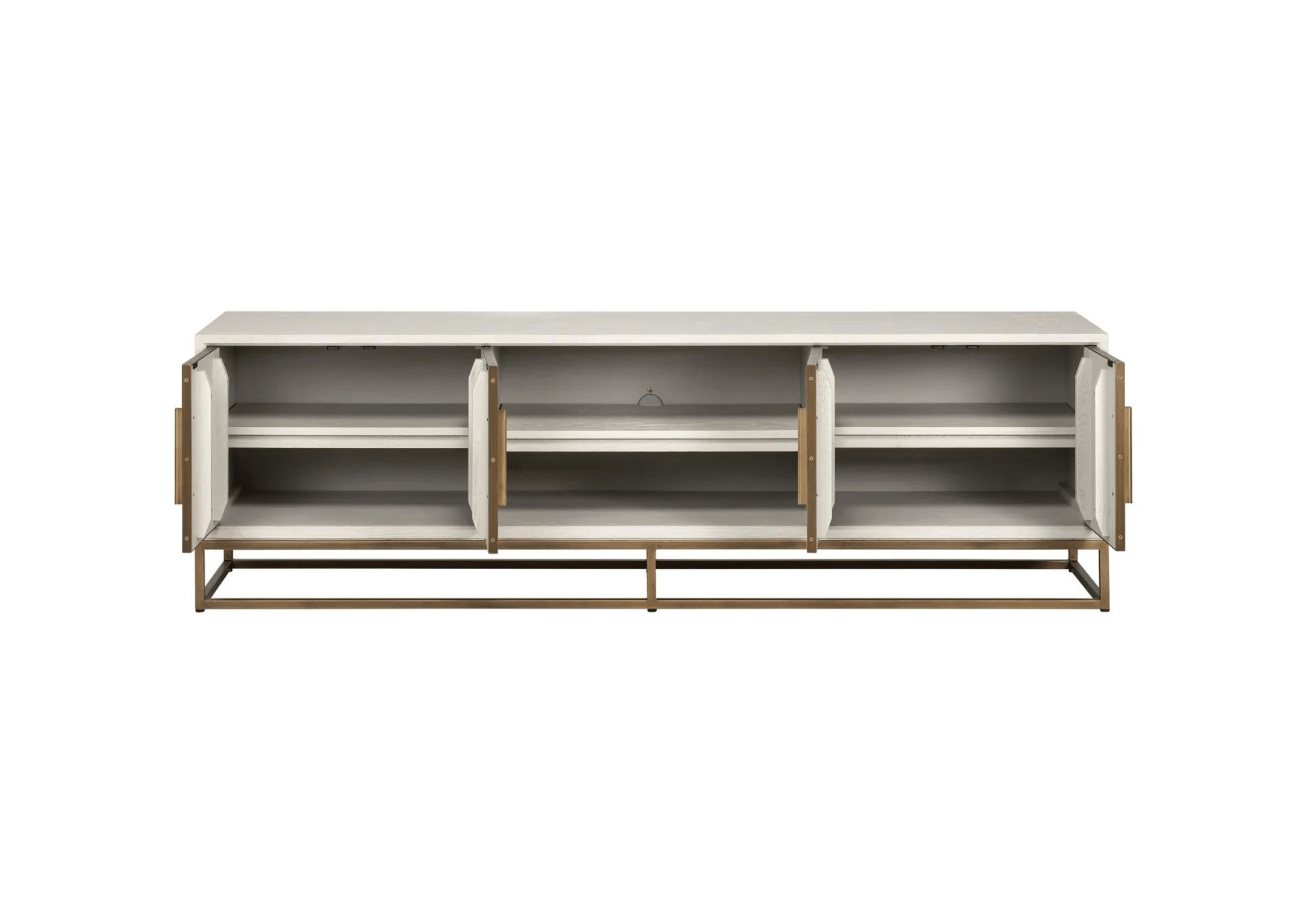 TV komoda Whitebone se vyznačuje vysoce kvalitní dubovou dýhou v elegantní bílém odstínu, a jemné kovové akcenty jí dodávají nádech industriálního šarmu. Díky čtyřem dveřím nabízí spoustu místa pro uložení multimediálních zařízení, DVD, herních konzolí a dalších domácích doplňků. Otevřená plocha je ideální pro umístění televizoru a dekorací.