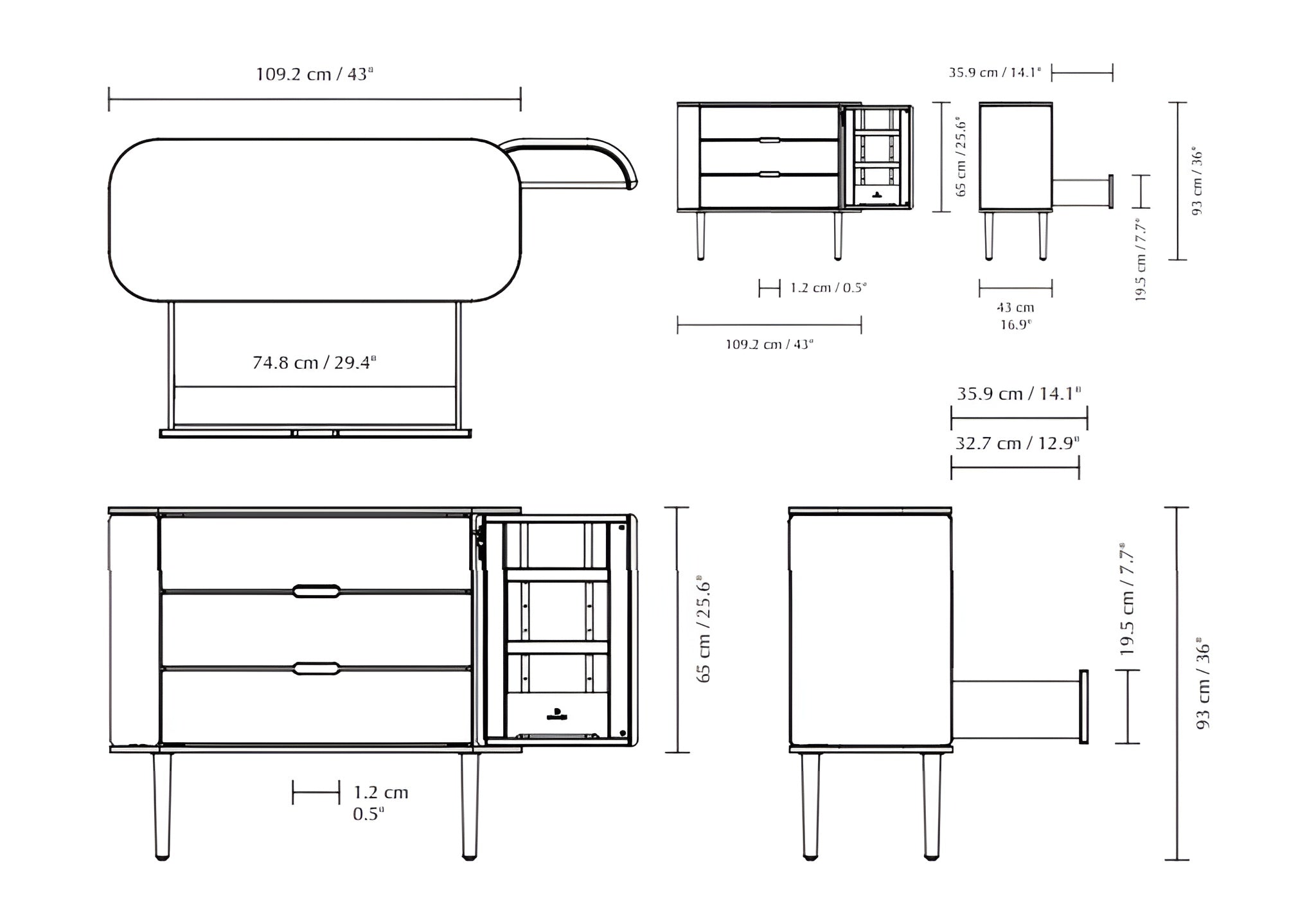 Dresser Treasures je elegantní a funkční skříňka, která spojuje jemné křivky s praktickým úložným prostorem. Za zaoblenými bočními dvířky, otevírajícími se jako křídla, se skrývá místo na šperky a drobné předměty. Tři prostorné zásuvky bez úchytů poskytují prostor na svetry, stolní nádobí nebo kancelářské potřeby.