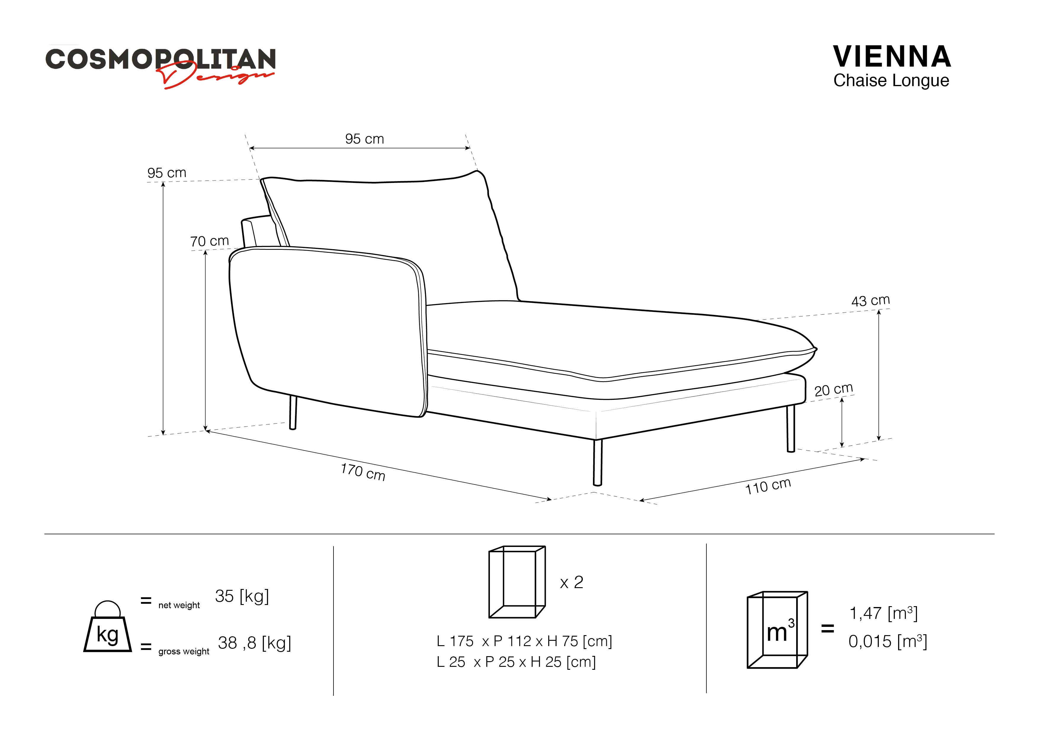 Wysokiej jakości tkanina welurowa imitująca aksamit charakteryzuje się nie tylko modnym kolorem, ale też dużą wytrzymałością na ścieranie. Szezlong będzie również idealnym uzupełnieniem pozostałych mebli z kolekcji Vienna, które zagwarantują idealny wypoczynek dla całej rodziny.