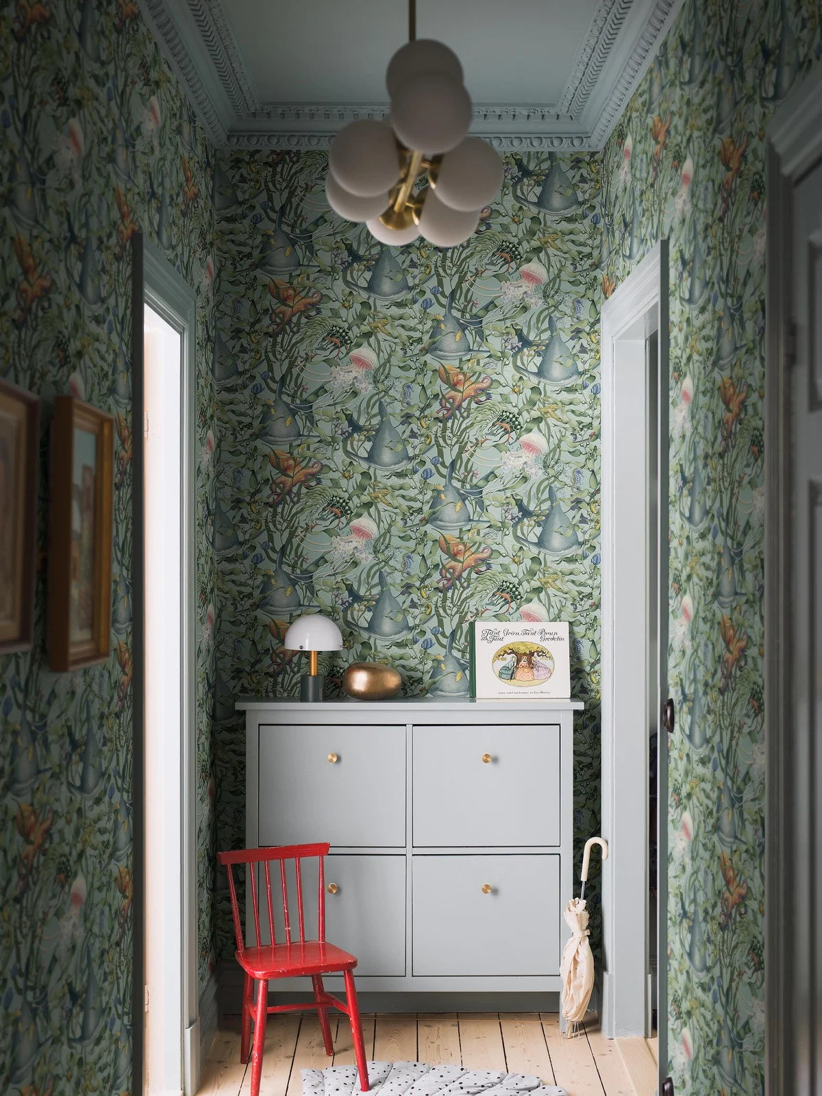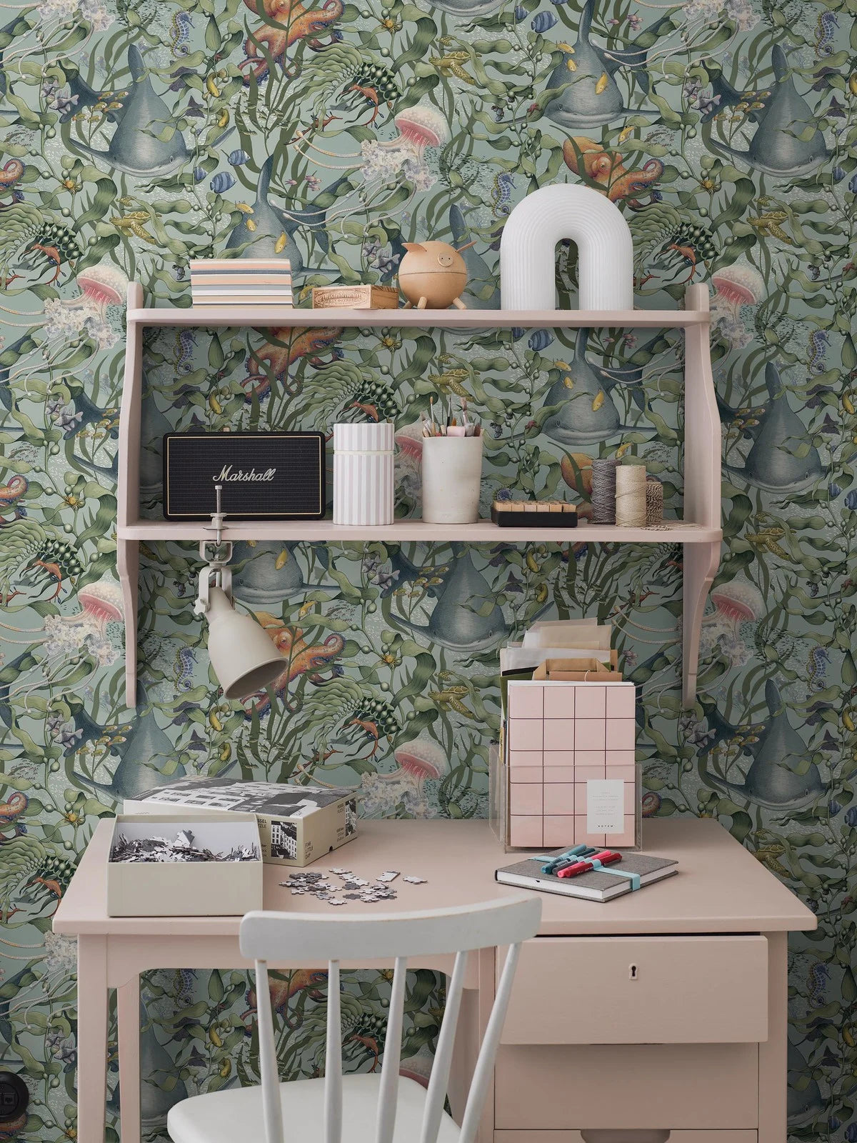 Ponadczasowy charakter tapety Underwater Magic sprawia, że doskonale sprawdzi się w pokoju dziecięcym jako dekoracja wspierająca relaks i kreatywną zabawę. Spokojna kompozycja oraz dopracowane detale budują przyjazne wnętrze, w którym dziecko może odpoczywać, marzyć i odkrywać fascynujący świat oceanu.