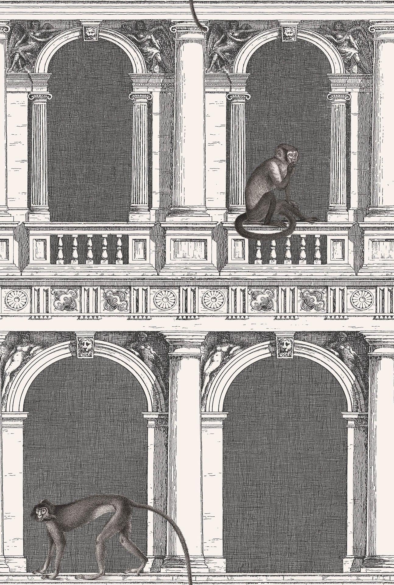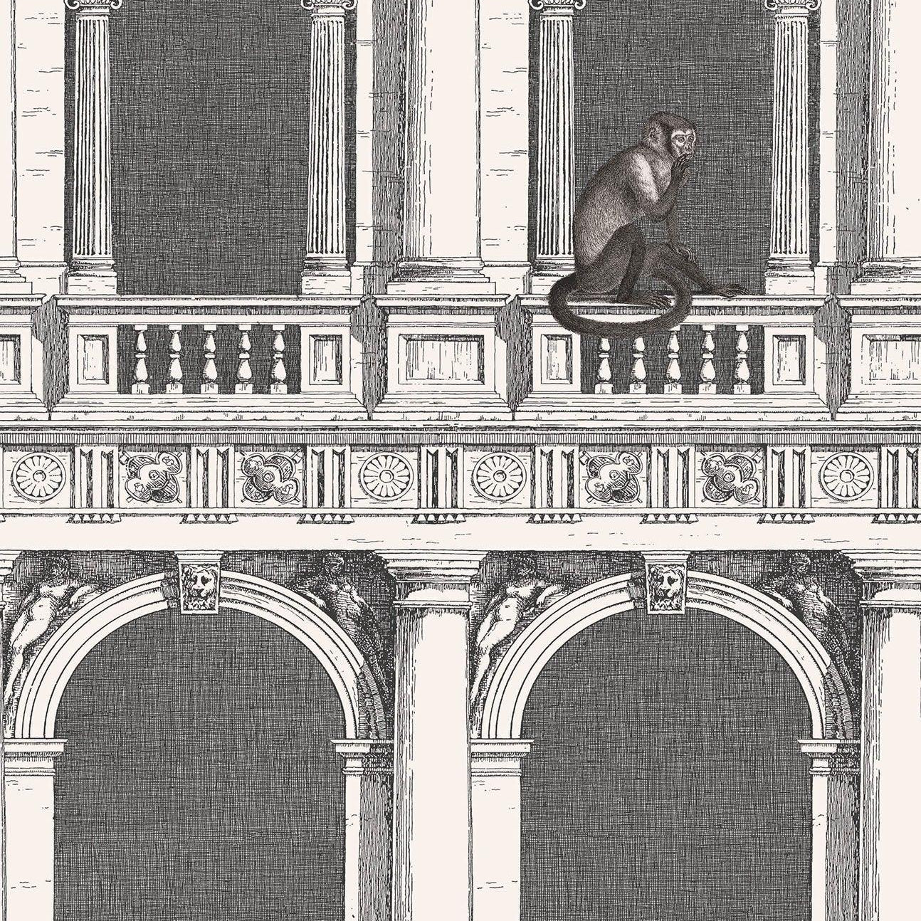 Tapeta s krajinou budov a zvířat FORNASETTI SENZA TEMPO - Procuratie a Opice světle šedá