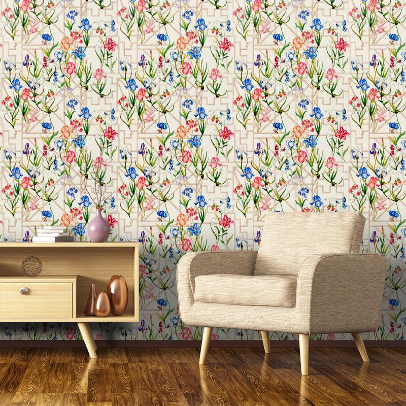 Tapeta Fretwork Garden Citron vás přenáší do neobyčejného světa elegantní zimní zahrady, kde se pnoucí bambus a exotické kosatce spojují v mistrovsky uspořádané panoramě. Toto výjimečné umělecké dílo, vytvořené značkou Christiana Lacroix, okouzluje precizností detailů a bohatstvím květinových motivů.