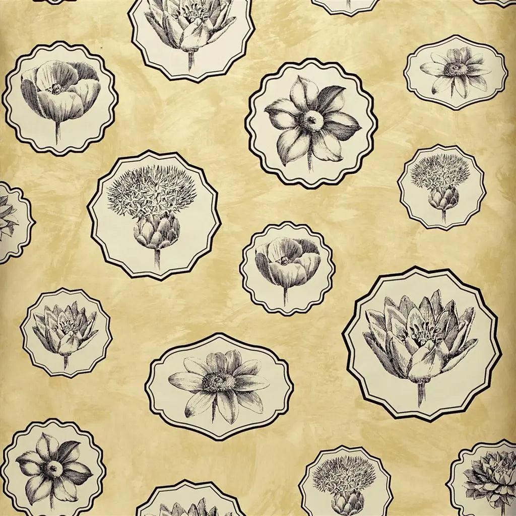 Tapeta Herbariae Dore je jako cesta do kreativního světa, kde složité, ručně kreslené ilustrace květinových motivů obklopené různorodými tvary ožívají na barevném pozadí. Tato ohromující, žlutá tapeta nás přenáší do světa Christiana Lacroix, vytvářející jedinečnou iluzi visících keramických talířů na zdi.