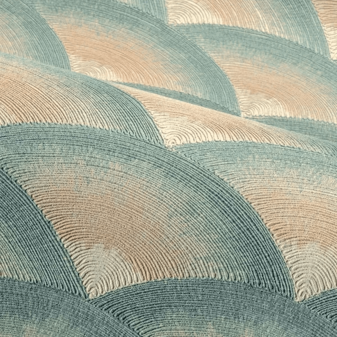 Tapeta strukturalna imitująca haft geometryczna w fale NAMI - CÉLADON/LIN szałwiowy z beżem