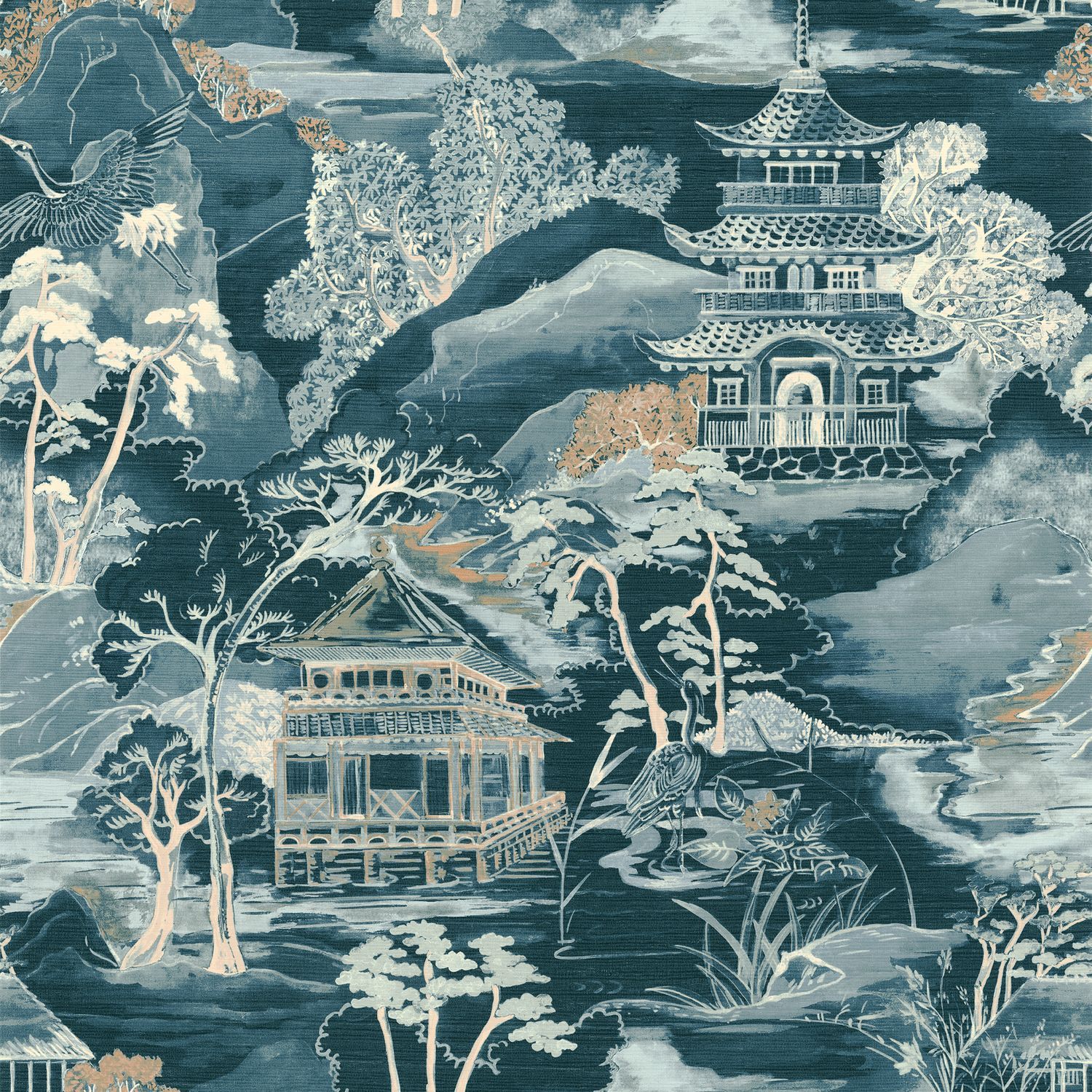 Tapeta se strukturou s orientální krajinou NARA - PETROLE granátová