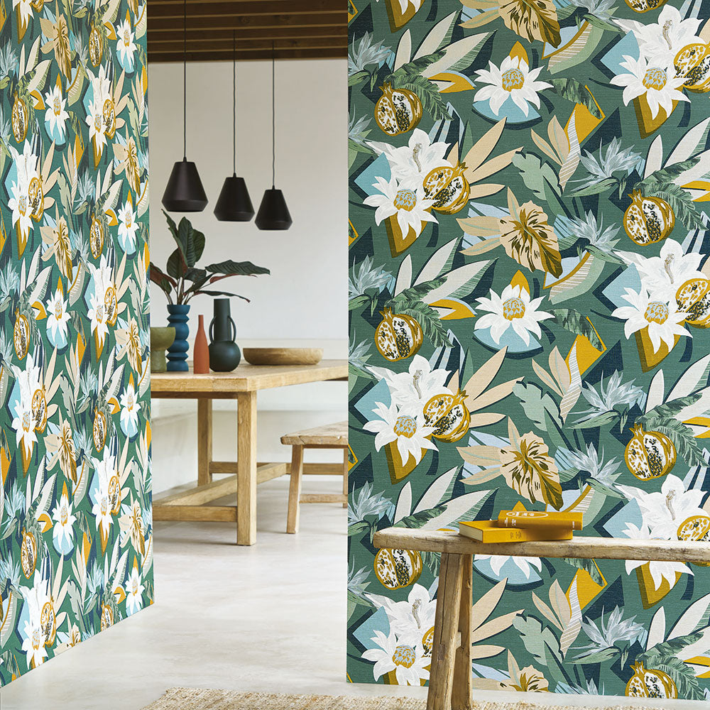 Strukturovaná tapeta s rostlinným motivem SALVADOR - MARINE/TERRE DE SIENNE granátová s terakotou