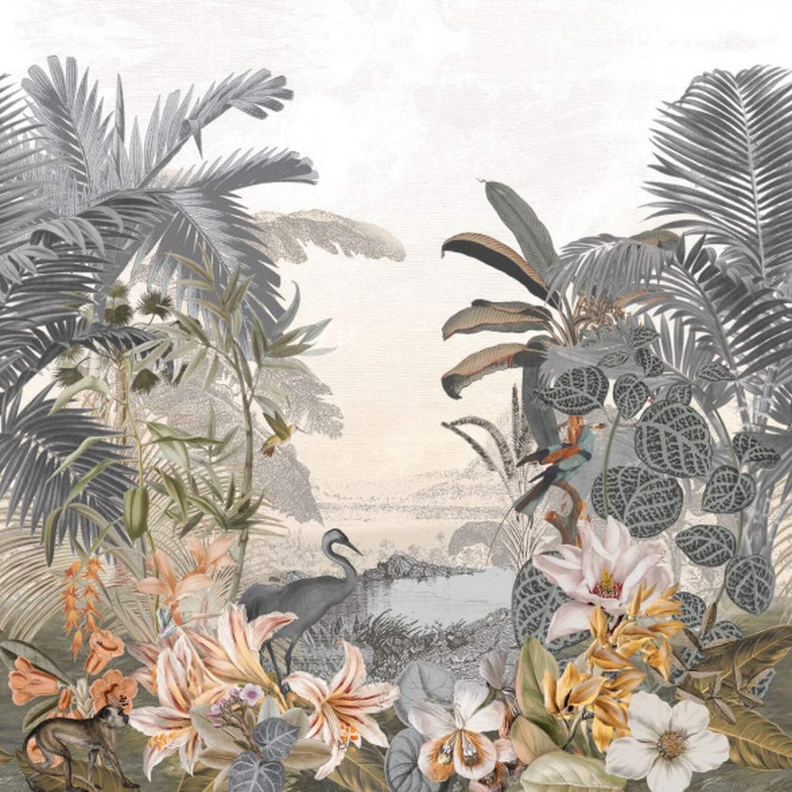 Textilní mural s exotickou krajinou PARAIBA, ztlumená modrá s béžovou