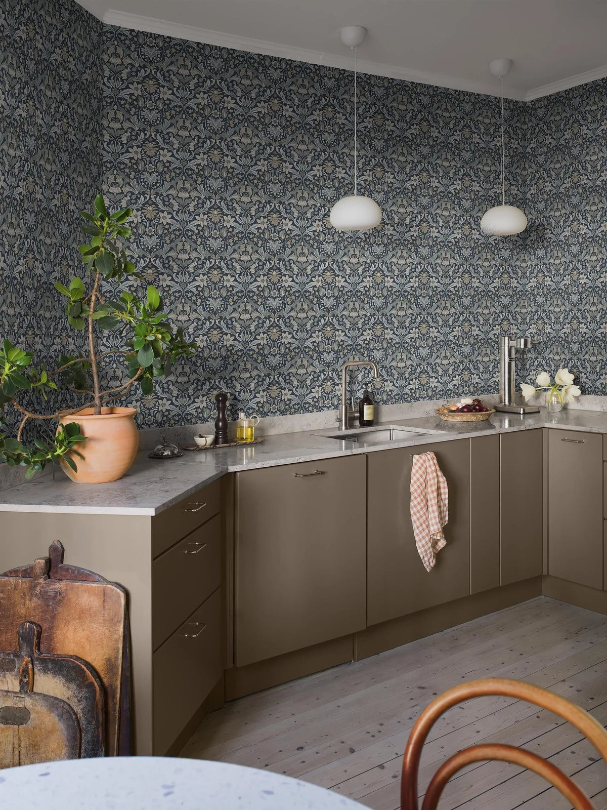 Tapeta Blomsterfröjd je elegantní návrh s rafinovaným a moderním charakterem, inspirovaný stylem Arts and Crafts. Hustý, dekorativní rostlinný vzor vytváří bohatou kompozici, která efektně rozvíjí na stěnách, dodávající interiéru útulnost a hloubku. Celkově okouzluje detailem a harmonickým uspořádáním, přinášející do prostoru výjimečnou atmosféru.