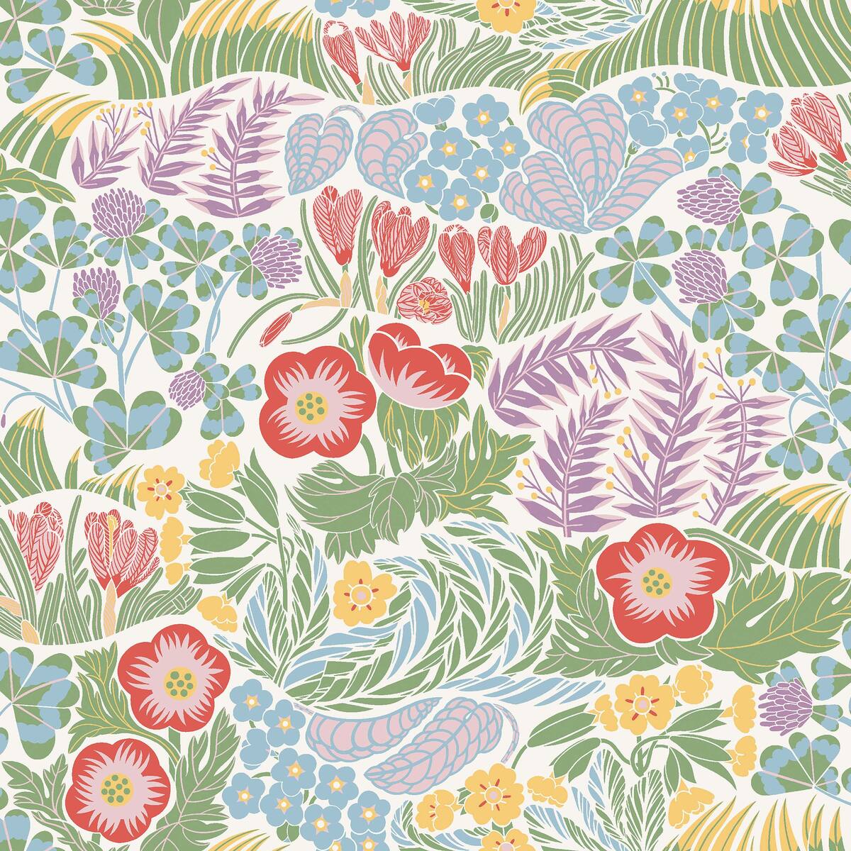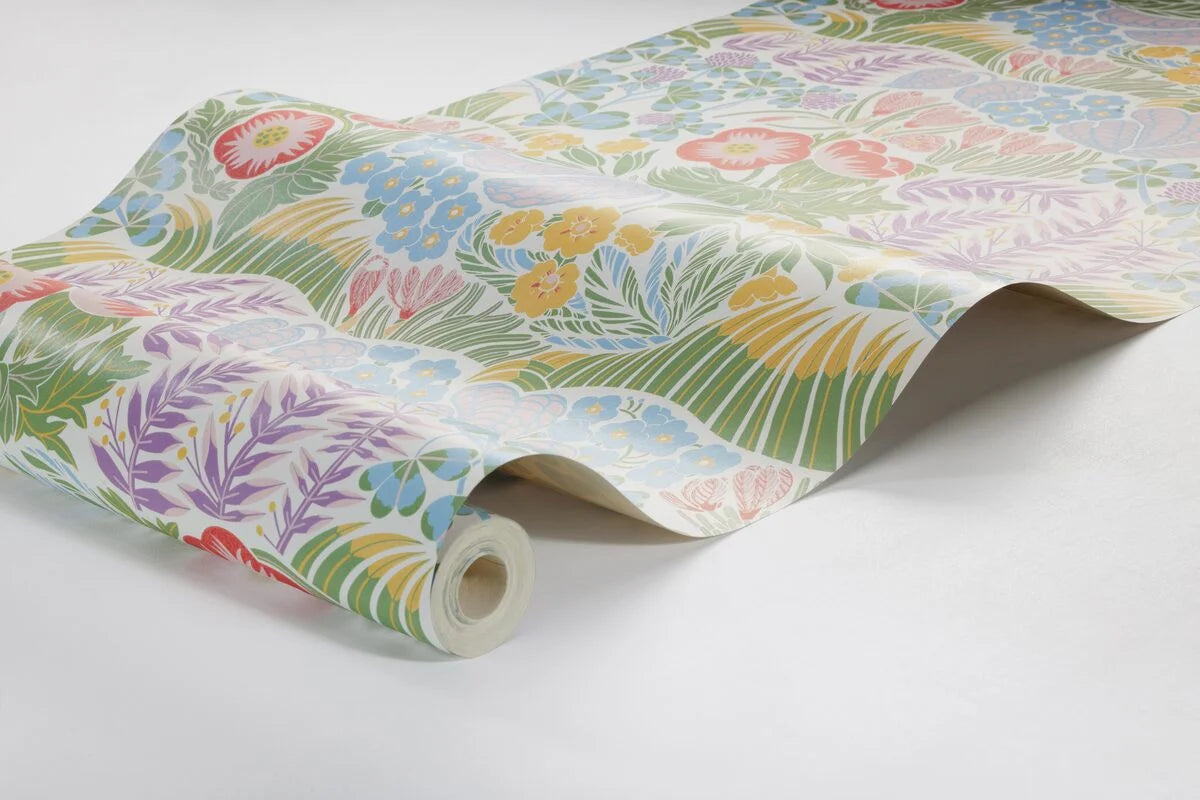 Tapeta Rabatt je výrazný a energický vzor, který vnáší do interiéru radostnou a dynamickou atmosféru. Bohatá paleta barev, včetně červené, zelené, modré, žluté a bílé, na černém pozadí, vytváří efekt živé, kvetoucí zahrady plné tvarovaných květin. Vzor inspirovaný stylem 60. let přitahuje pozornost a dodává prostoru moderní, retro charakter.