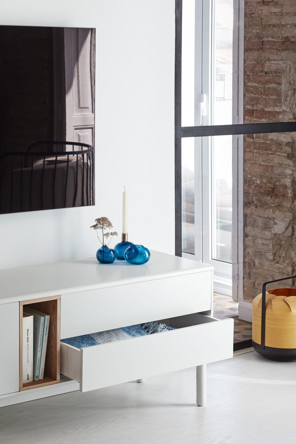 Minimalistické nožičky dodávají celé konstrukci lehkost. Krémová barva se skvěle hodí téměř do každého interiéru. Pokud hledáte efektní RTV skříňky do obývacího pokoje, abyste vsadili na Corvo.