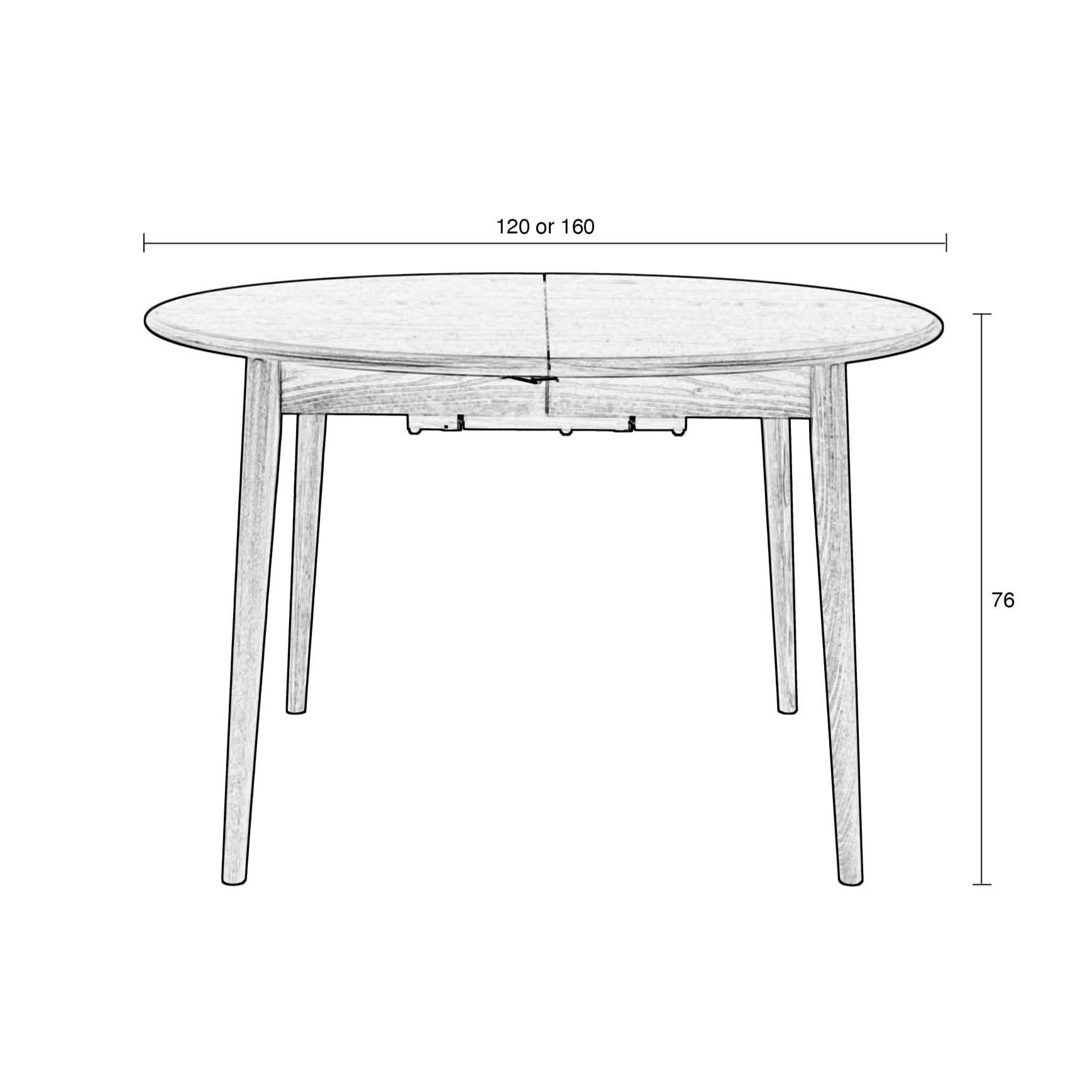 Ten owalny stół rozkłada się ze 120x120 cm na większy, do 160x120cm.