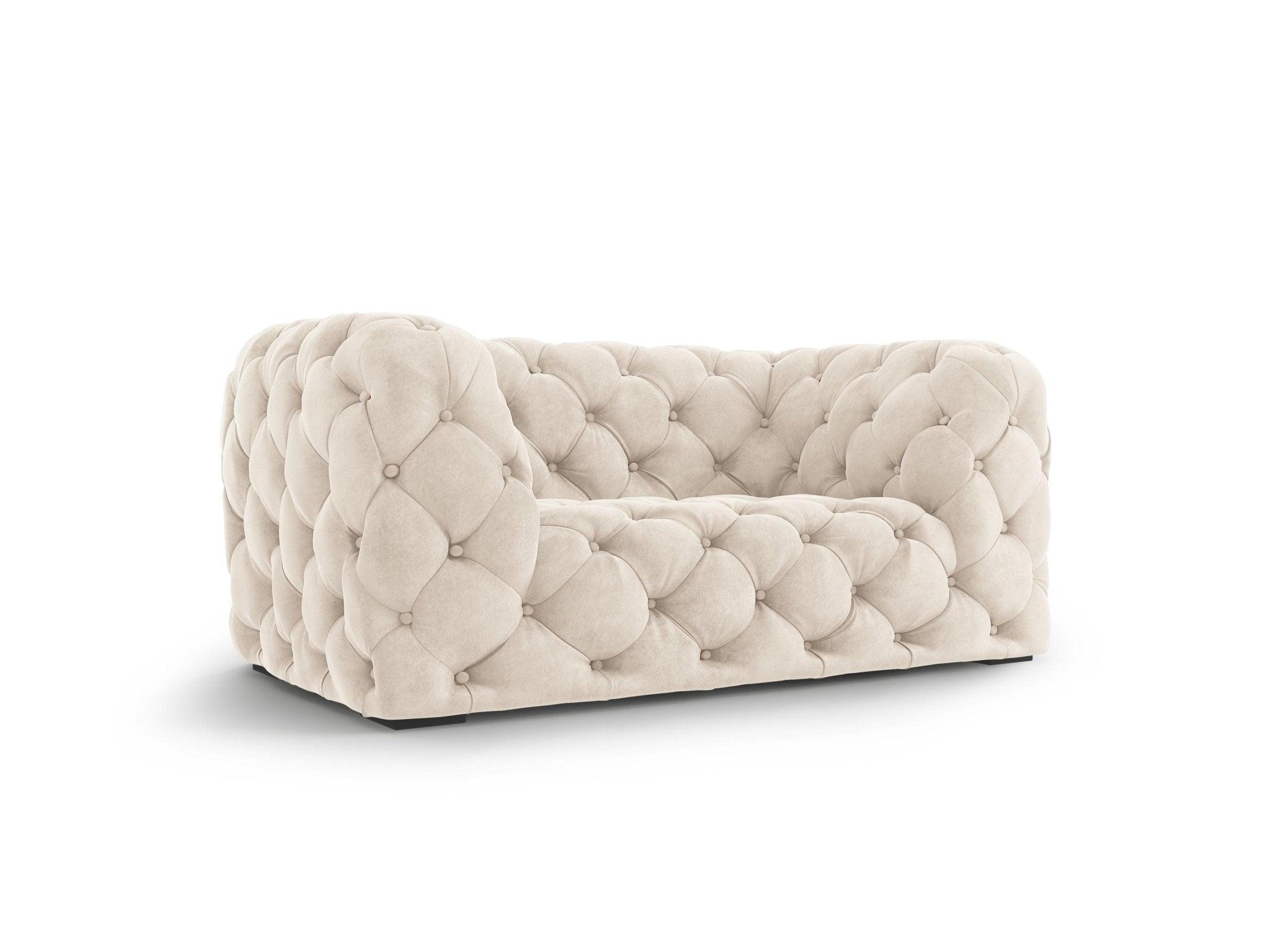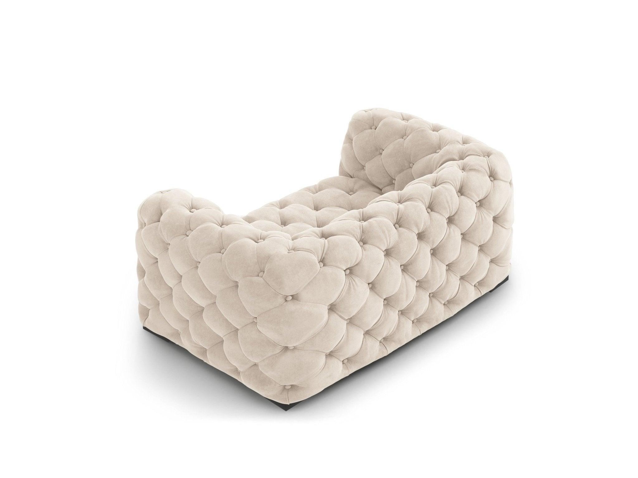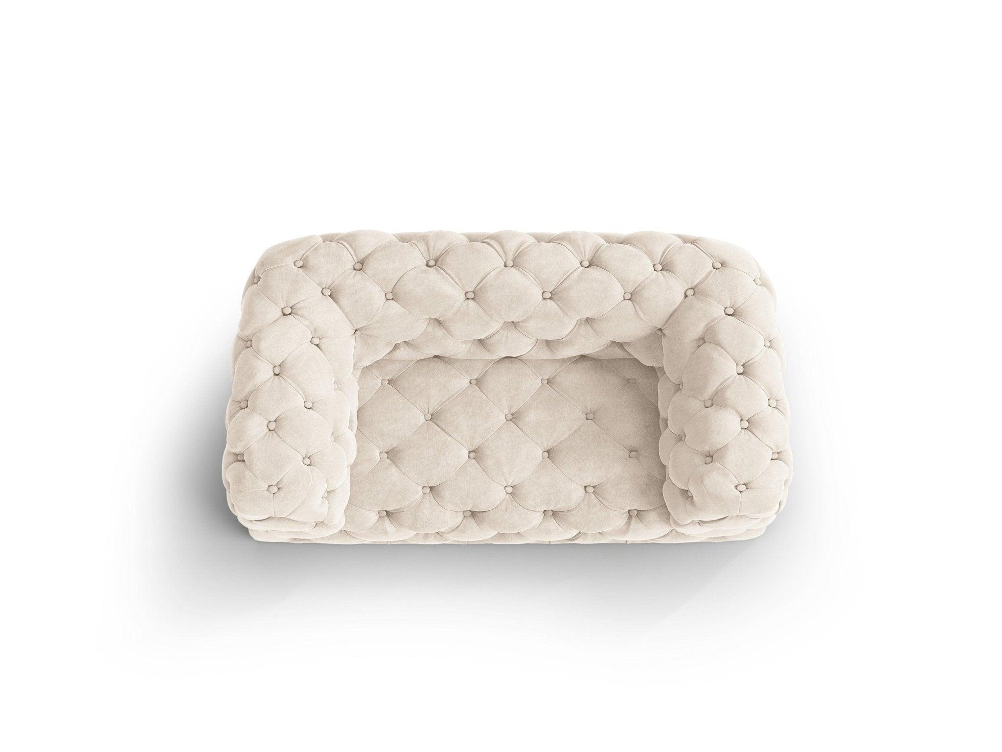 Sametový křeslo Loge je neobyčejné spojení klasické formy s nádechem luxusu. Neotřelý design vynikne v každém obývacím pokoji a vnese do prostoru kousek elegance. Hluboké prošívání a dodatečné švy ve tvaru čtverců jsou zvýrazněny dekorativními knoflíky.