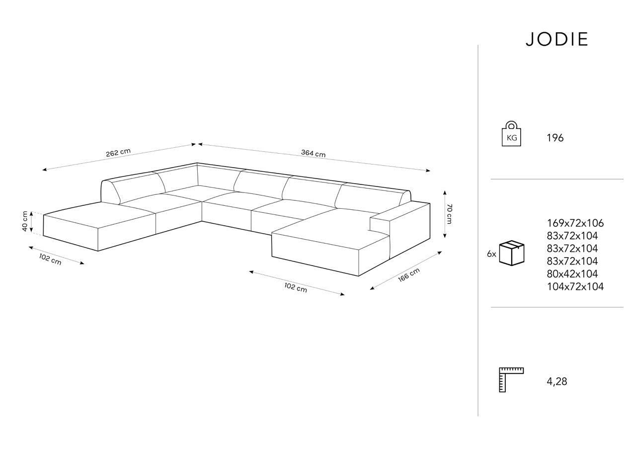 Pohovka Jodie je velmi pohodlná díky svým velkým rozměrům, které umožňují sezení až sedmi osobám. Navíc má měkké, pohodlné opěrné a sedací polštáře, které zajišťují komfort při používání.