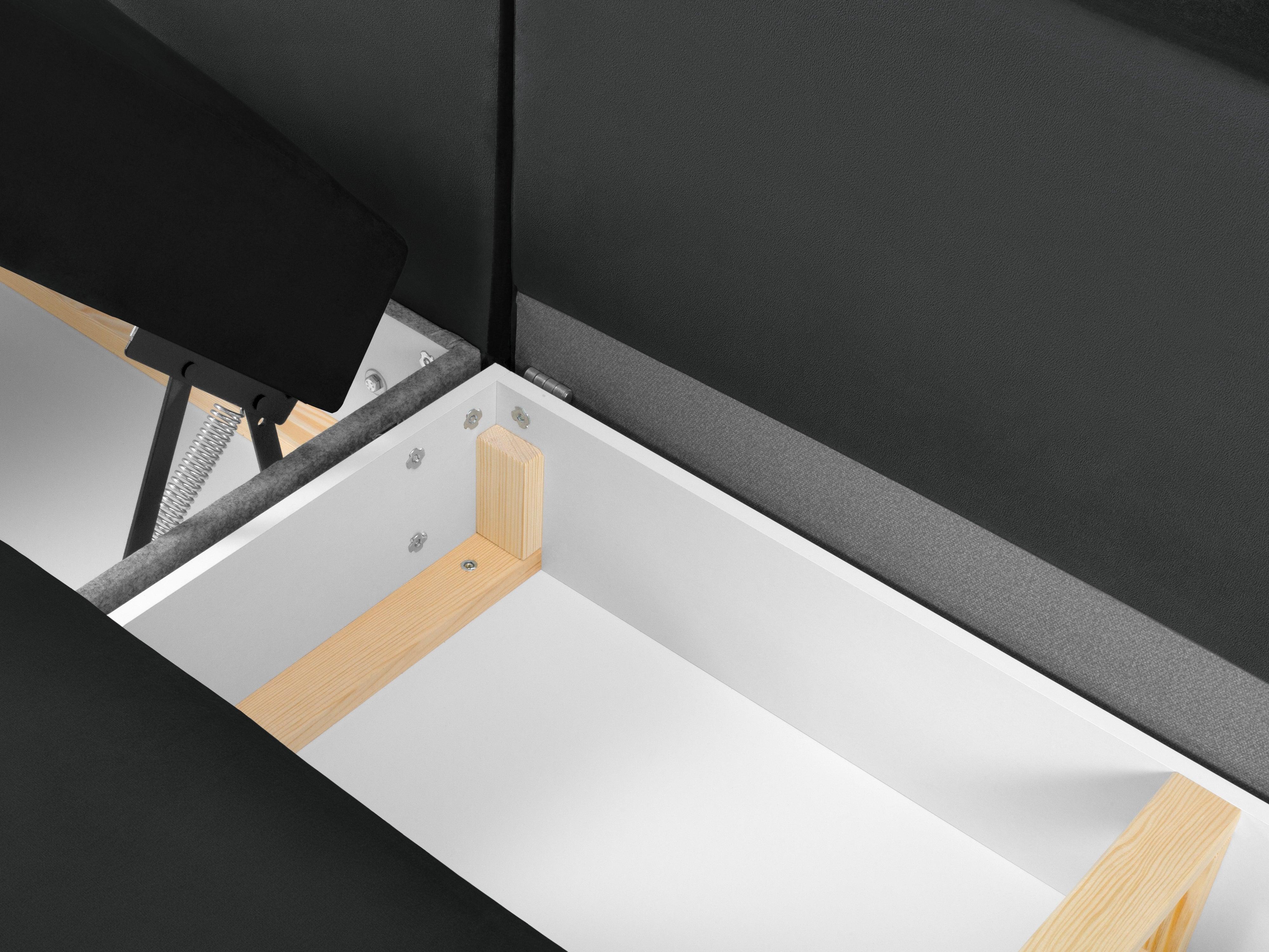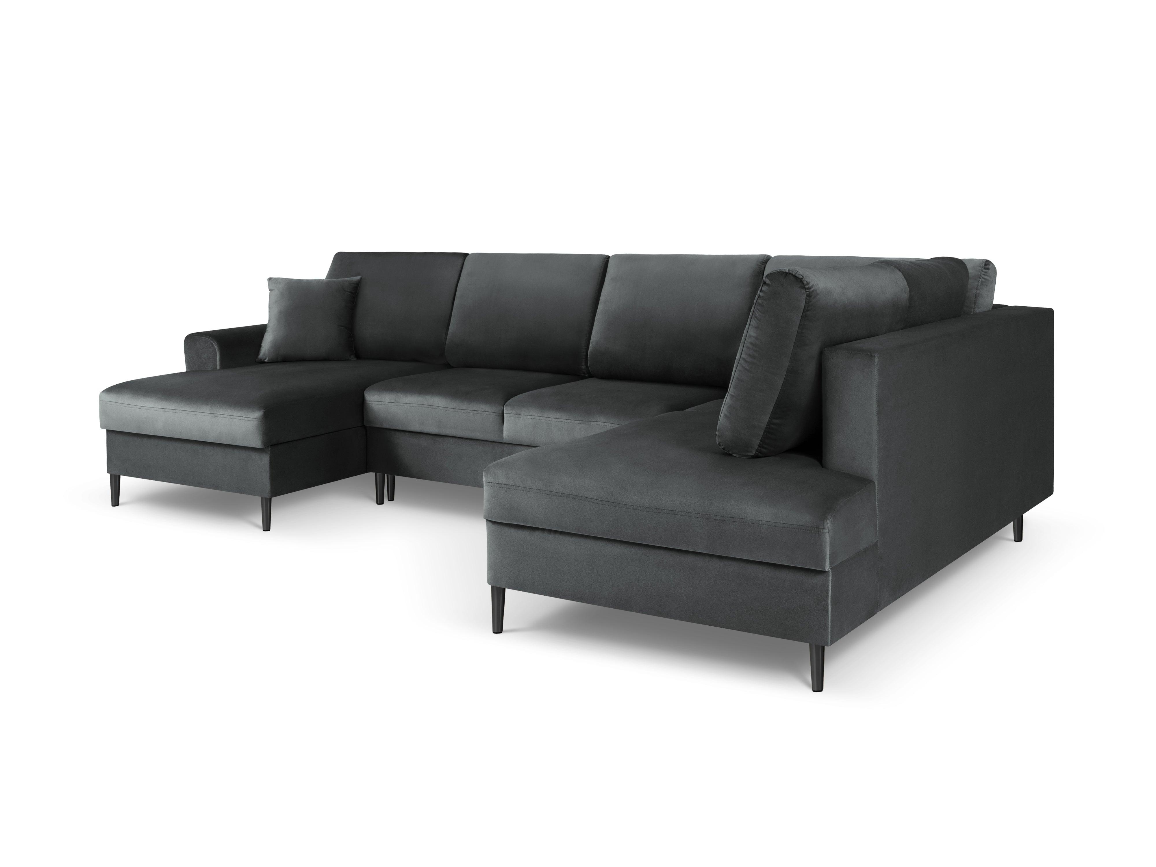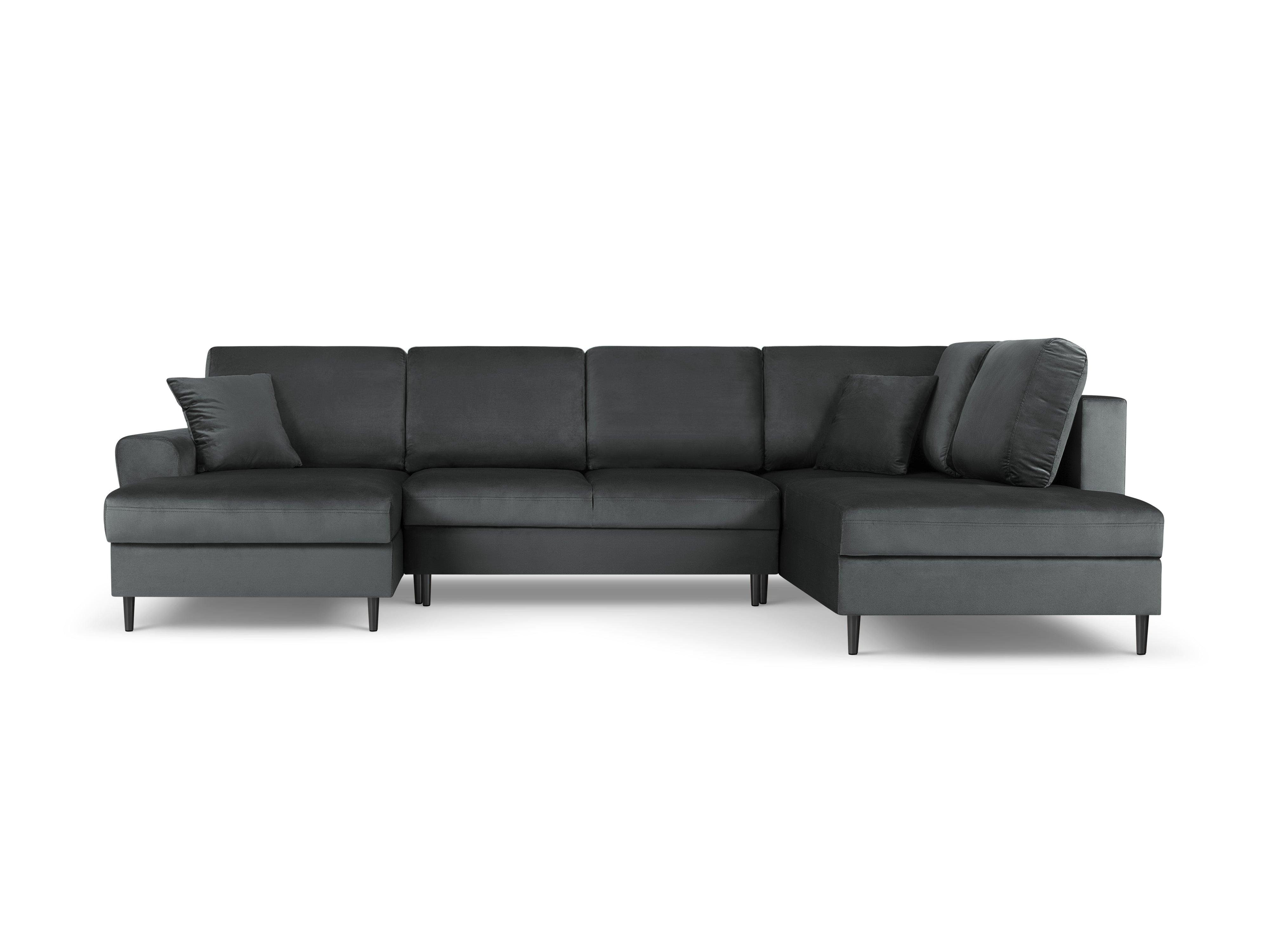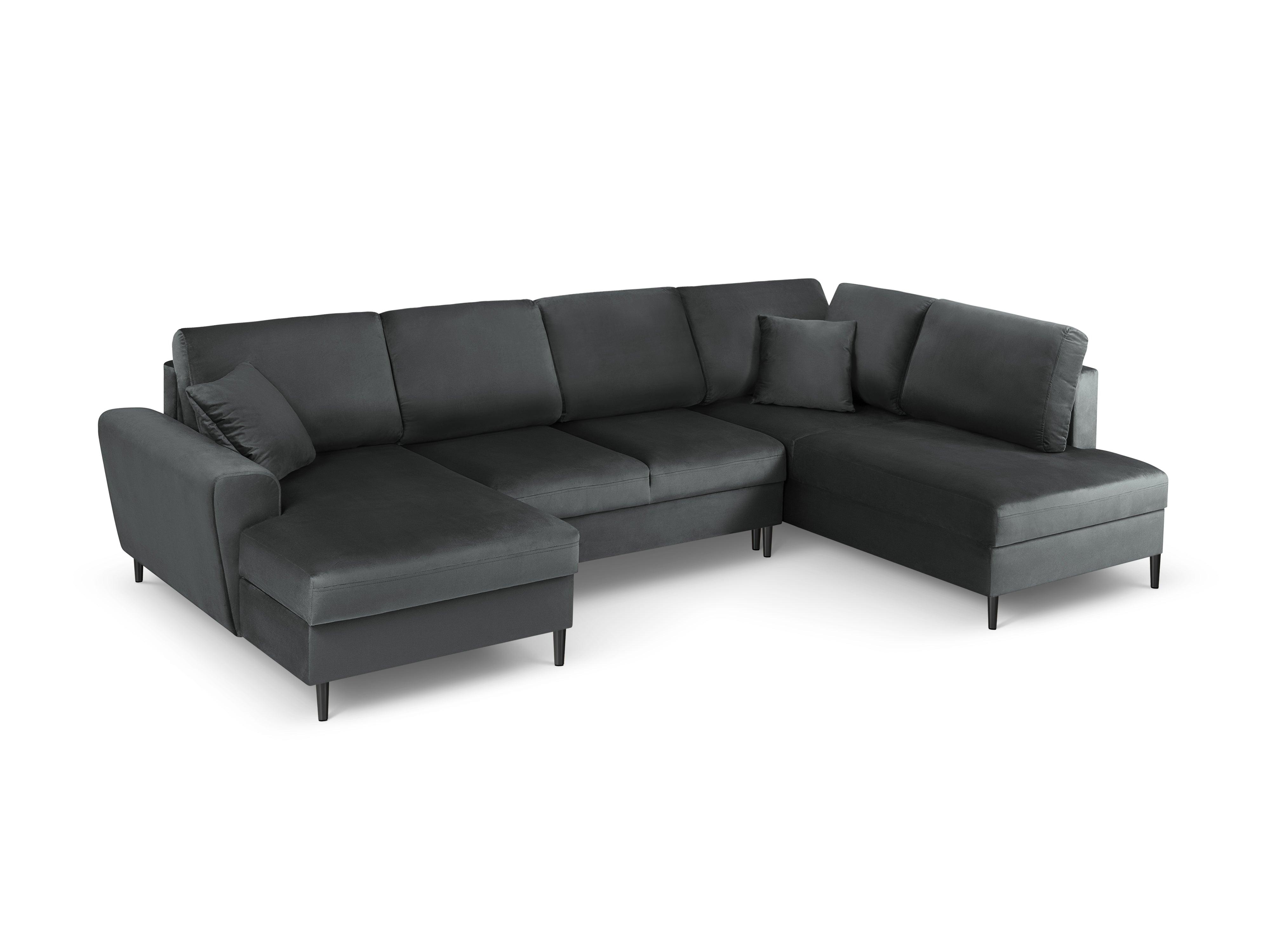 Pravostranný sametový panoramatický rohový gauč s funkcí spaní KYOTO tmavě šedý s černým podstavcem