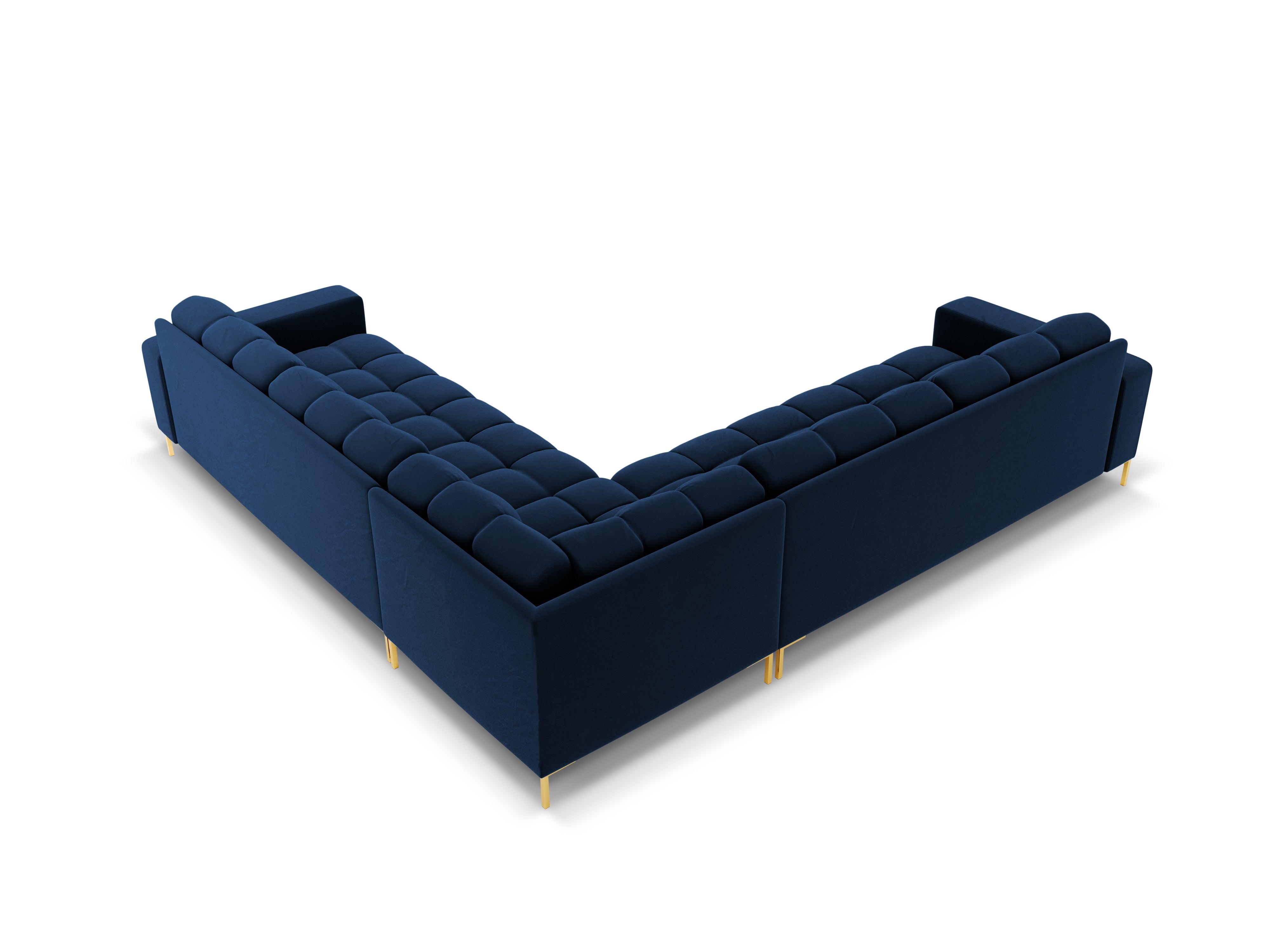 Symetrický sametový rohový gauč BALI v královské modři se zlatým podstavcem