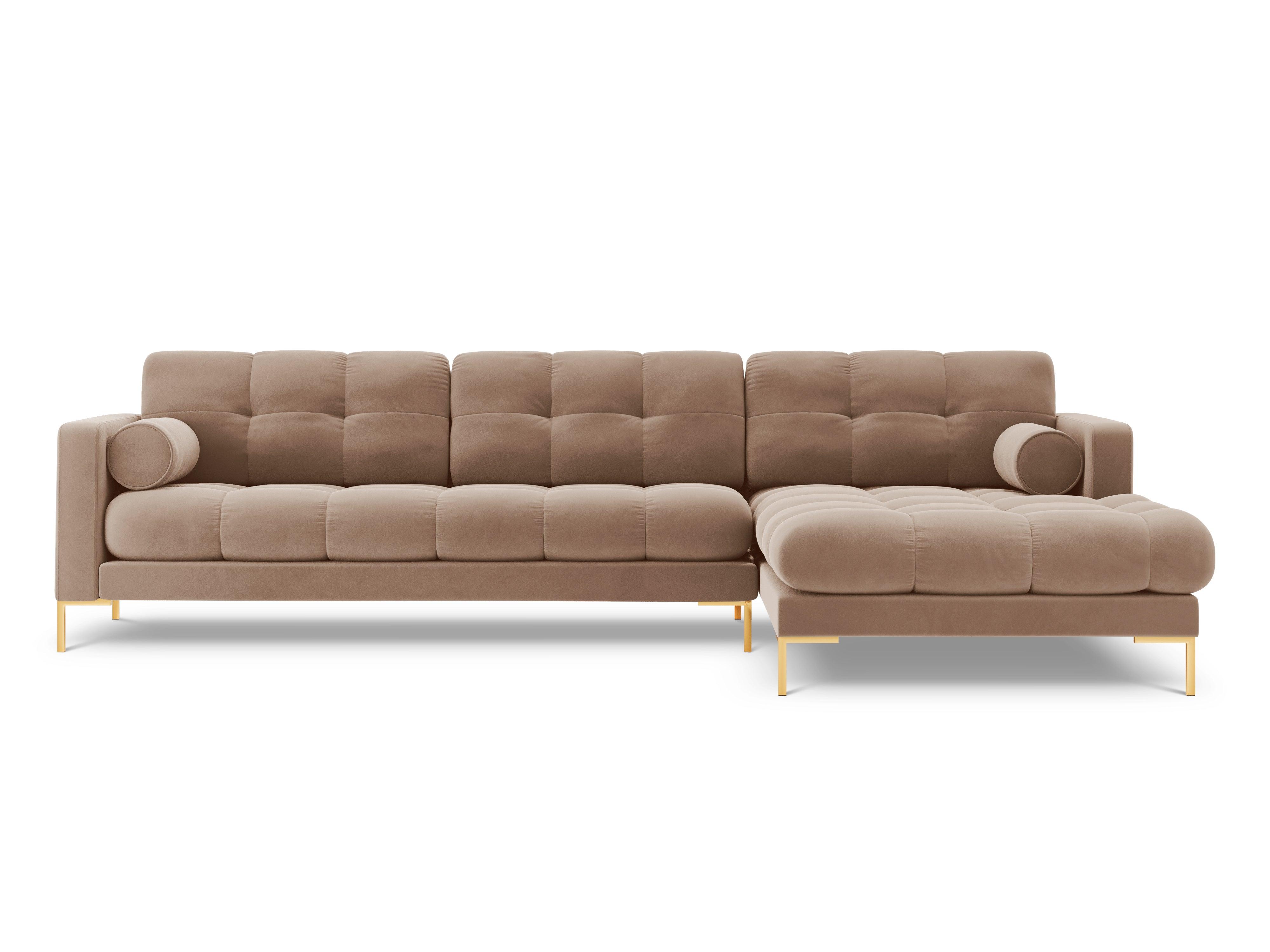 Sametový rohový gauč BALI pravostranný béžový se zlatým podstavcem