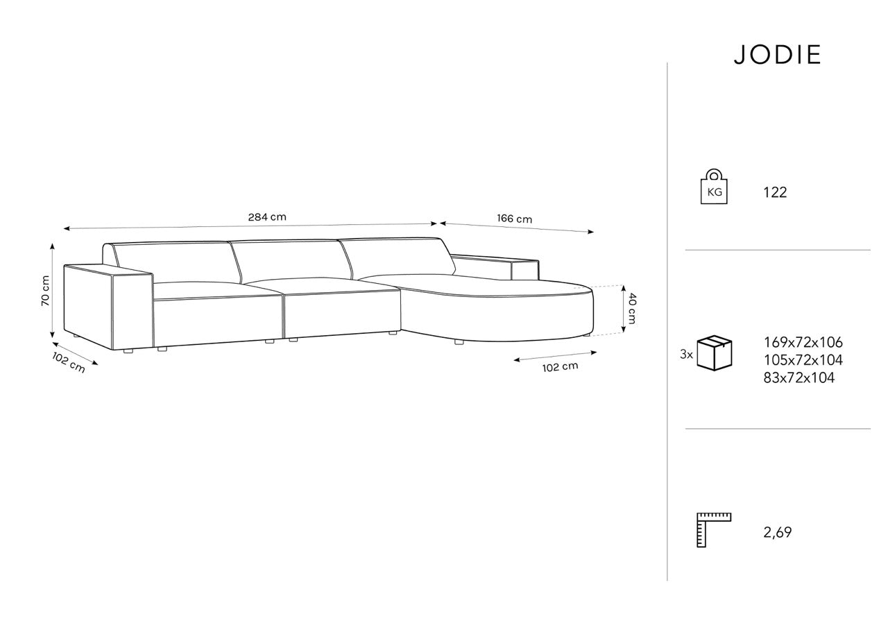 Jodie je pohodlná rohová pohovka pro čtyři osoby, ideální do odpočinkového prostoru. Tato pohovka má elegantní a moderní design, který přinese do vašeho interiéru styl a harmonii.