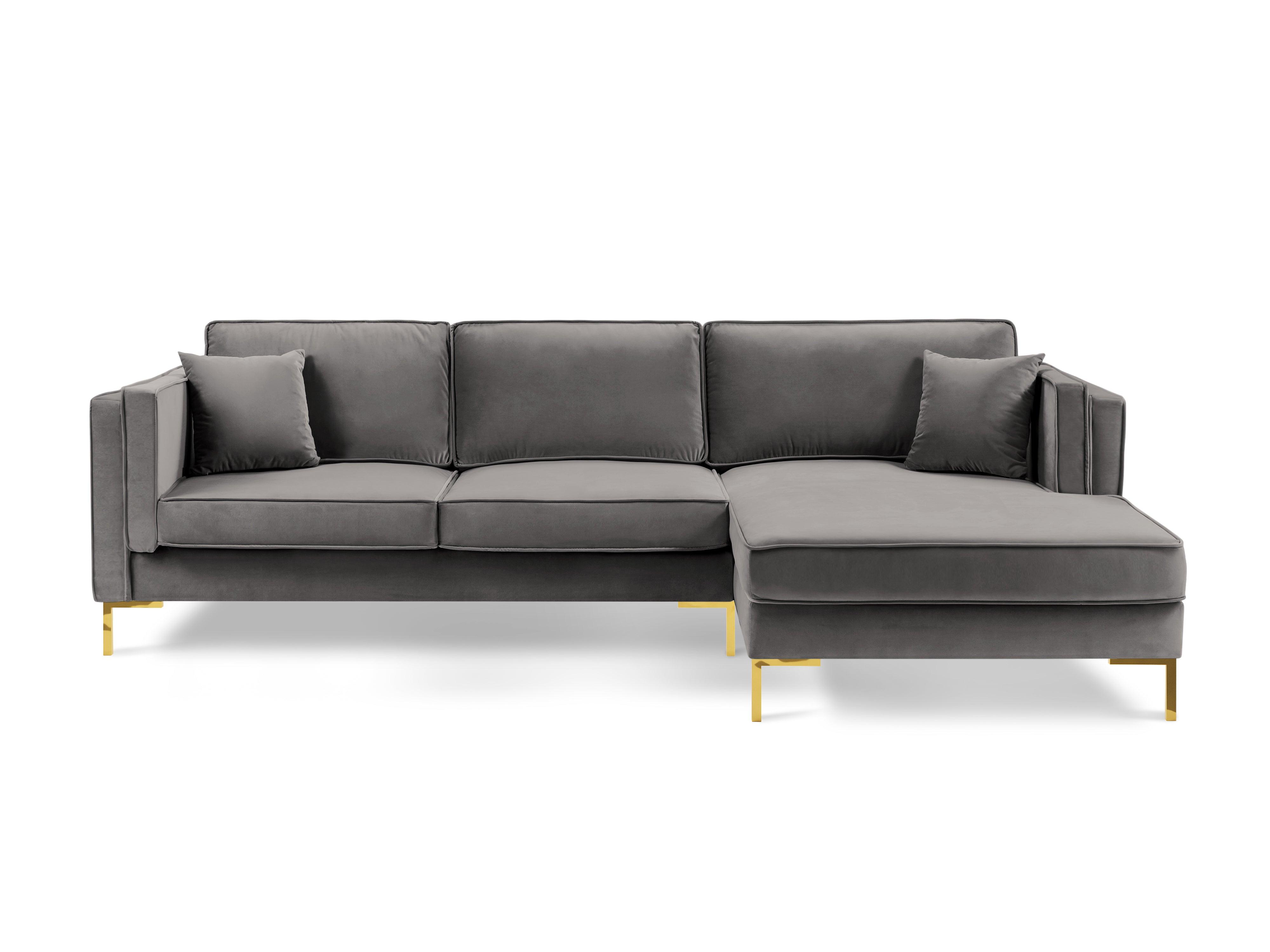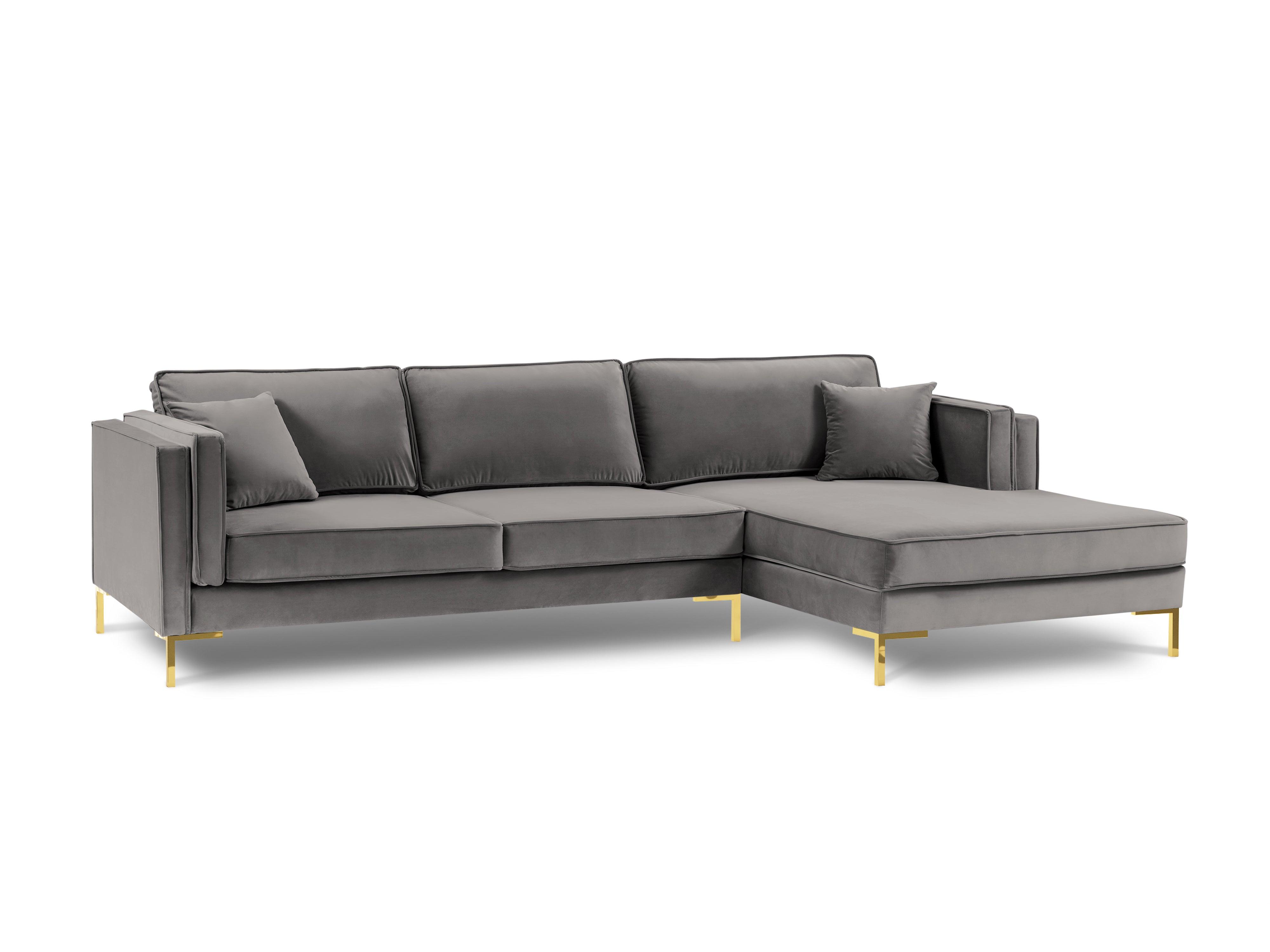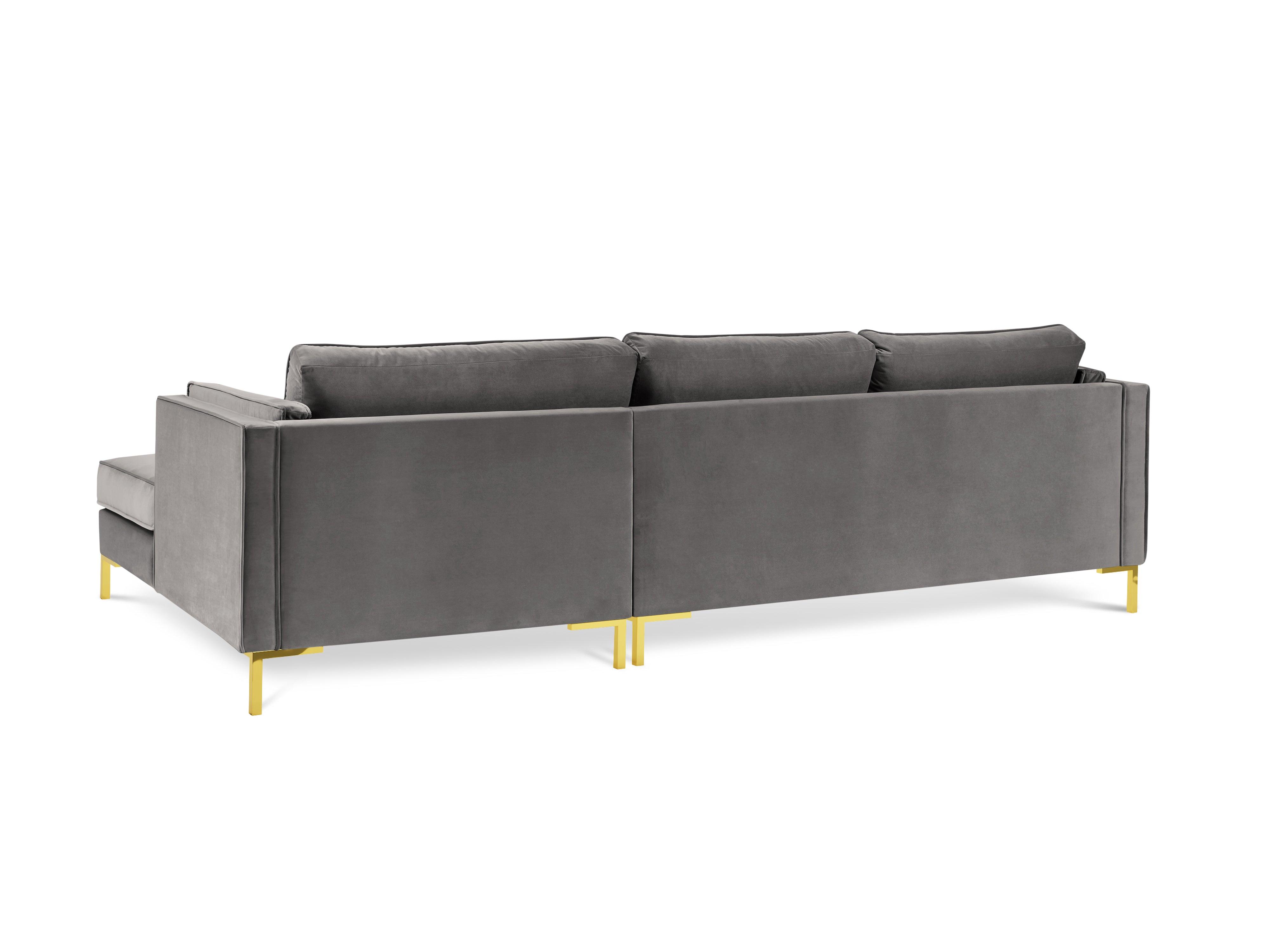 Svetle šedý sametový rohový gauč LUIS s zlatým podstavcem
